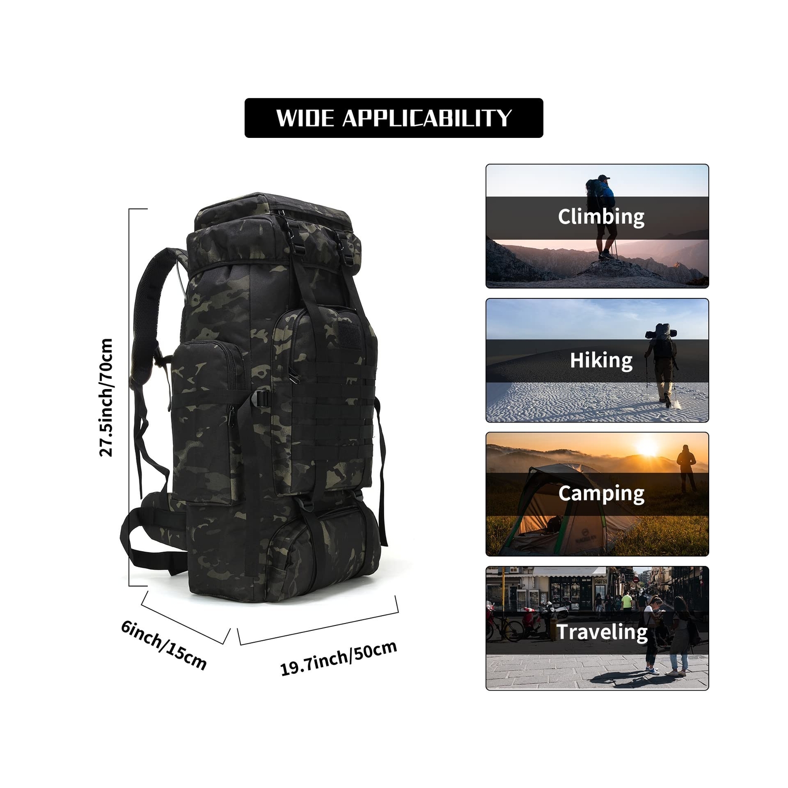Brand New Hiking Backpack for Men 70L/100L Camping Backpack Military Rucksack Molle 3 Days Assault Pack for Climbing Manufacturer model: Backpacks Hiking Backpack Structure: The 70L camping backpack main compartment is drawstring closed, hiking backpack roomy enough for you storage hiking gear, shoes and luggage, 1 laptop compartment, 1 front zipper pocket and 2 side pocket for separate and orderly storage. stable & Improvement: We continuing to upgrad this climbing backpack, including fabric, accessories, comfort and and durability. 900D oxford fabric that water resistant, tearable and anti-scratch, stable than same hiking backpack, help for your perfect trip. Molle Backpack Men: Military backpack external molle system designed to be used attach other hiking gear or tactical pack. As assault pack backpack, military tactical backpack, backpacking backpack, climbing backpack and camping hiking backpack for outdoor enthusiasts. Size & Lightweight: Dimension 13.4*6.7*28.75 inches, this mountaineering backpack weighs only 2.86lb for easy carrying, and adding no burden to your travel. Perfect size for camping backpack, hiking backpack, trekking backpack, traveling backpack, hunting backpack, climbing backpack. Description Tactical Travel Backpack MOLLE Rucksack 70L Waterproof Camouflage Suitcase Hunting Mountain Sports Trekking Camping Dimensions: 13.4*6.7*28.75 inches Material: 900D oxford,waterproof,stable and practical Waterproof tactical hiking backpack is perfect use in travelling ,hiking , camping , climbing and other outdoor activity, as gift for birthday and father's day Molle system backpack features: - Adjustable more capacity,can extend the space you need by molle system. Scientific belt structure design,match with soft and wide waist belt,to disperse more stress from the bag,protect your shoulder and back,and feel more comfortable when carry many many stuffs. - large capacity, 70L camouflage bag, hidden rainproof design, two-way zipper - Side pocket design, items that can be placed in the kettle umbrella; Top pocket design, can be put into the wallet and other items; Bottom pocket design, can be put into the wallet and other items Tips: - Pack your bag tightly through drawstring line and belt buckle,you will feel light when back heavy stuff - inclined forward when walking,hiking,to help disperse the weight on shoulder Note: - The product is measured manually and may vary, please refer to the actual size. - The arrival time is about 8-21 days, please be patient. After receipt, check the goods. - If you have any questions, please feel free to contact us by email. I am very happy to serve you and wish you a happy shopping. Shipping and Handling Please allow 5-7 business days for the package to arrive, regardless of buyer location within the US. We will provide an online tracking number to you once the item has been shipped. It may take a few business days for our automated system to process the tracking number onto eBay. However, this will not affect the shipping times. Return Policy All our products are brand new and sealed. All items qualify for returns within 30 days of receipt. Feedback We take our reputation seriously. If you have any questions or concerns, please contact us and we will respond back to your message within 24 hours.