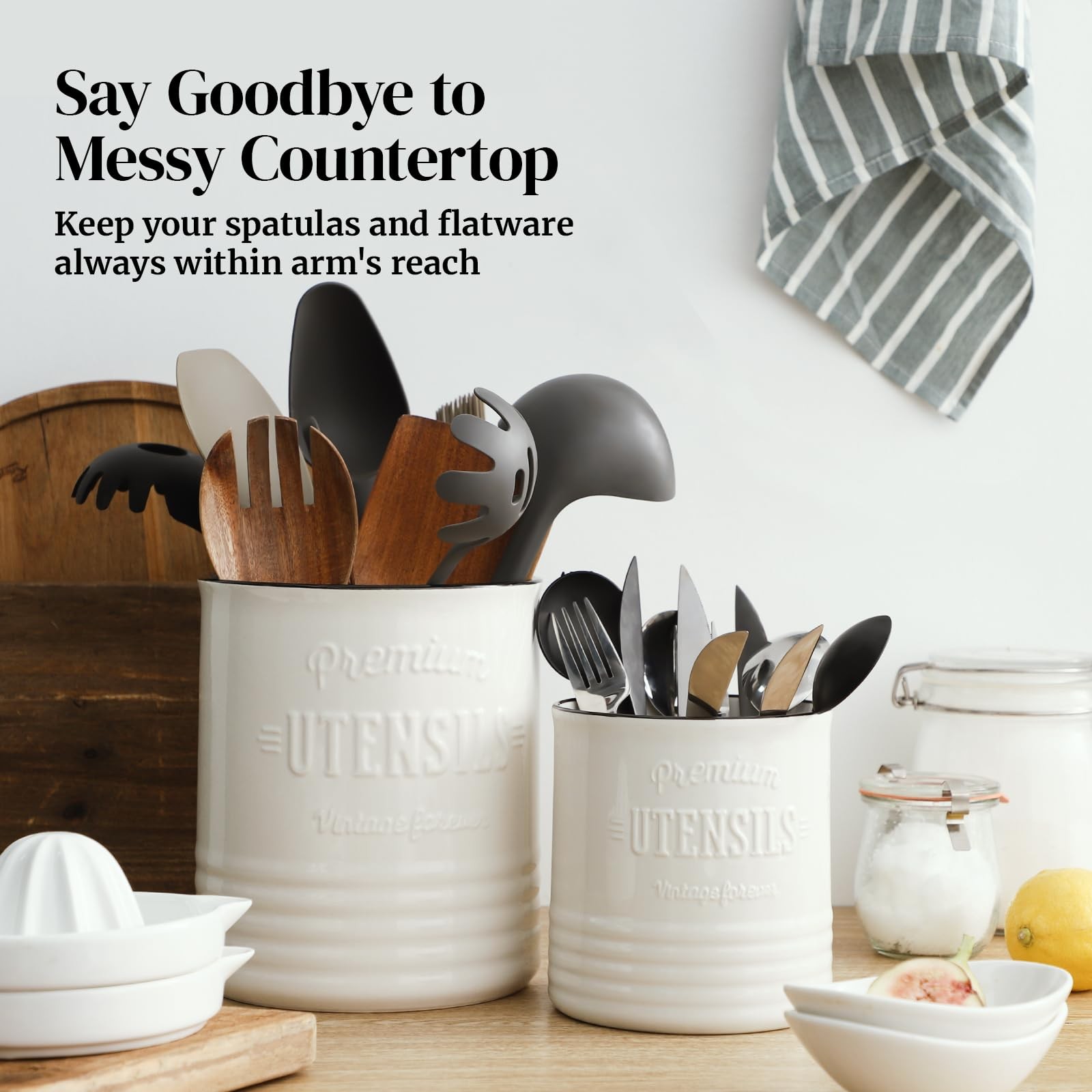 7.2″ Extra Large Kitchen Utensil Holder, Farmhouse Utensil Holder for Countertop, Ceramic Utensil Crock with Protection Cork Mat, Utensil Organizer for Kitchen Decor & Housewarming Gift, White Vintage Home Decor: This elegant and multi-purposed optimal utensil holder for kitchen counter, also serving as a utensil caddy or vase, is the best for those seeking a trendy, rustic farmhouse look. Add a little country charm to your home decor! If you’re looking for a memorable gift for your love, look no further, this will be a great gift she will use. Large and Deep Ceramic Cooking Utensil Holder: With a generous size of 7.2″H x 6.2″W, this super large container is designed to hold 15-20 cooking utensils, ensuring your tools are always easy to access when you need them most. From spoons and whisks to spatulas and more, this utensil storage comfortably accommodates utensils ranging from 10 to 16 inches in length, keeping them tidy and ready for use. Stable and Fall-Prevention: Unlike typical metal or stainless steel utensil holders, this weighted ceramic kitchen utensil holder is sturdy and stable, effectively preventing utensils from tipping over and causing spills in your kitchen. Counter Protection Cork Mat: Featuring a specialized cork mat at the bottom, this white ceramic utensil crock offers enhanced protection for the surface of your table or countertop, effectively preventing scratches and damage. Easy to Keep It Shiny: Crafted to be smooth and resistant to scratches, this spatula holder, is effortless to keep clean. You can wipe with a damp cloth or wash with soap to maintain the luster of this utensil jar, and the embossed lettering is designed to remain intact over time. Shipping We offer FREE shipping on all orders! We ship within Three business days of payment, usually sooner. We use a selection of shipping services such as UPS, FedEx, USPS etc. We only ship to the lower 48 states, no APO/FPO addresses or PO Boxes allowed. Local pickups and combined shipping options are not provided at this time. International buyers – please note: Import duties, taxes, and charges aren't included in the item price or postage cost. These charges are the buyer's responsibility. Please check with your country's customs office to determine what these additional costs will be prior to bidding or buying. Order Cancellation Policy * Order Cancellation Policy ** You can return a product for up to 30 days from the date you purchased it. 1. The seller reserves the right to cancel the special case only due to eBay cancellation fee. 2. The decision of seller is the final. 3. The seller will respond to the cancellation request within 2 business days. Please wait for the result of cancellation. 4. In case the cancellation is not completed by some reasons, the buyer can follow the options below to get the refund. 4.1 The buyer can reject the item when it arrives. 4.2 The buyer can send the item back to the seller within 30 days If the buyer receives item (USA Shipment ONLY). The seller will provide the FREE return label to the buyer when the buyer opens " Return Item" case on eBay by using the reason as "Change my mind" ONLY. 5. When buyer has placed the order. The order will be processed and completed by automatic warehouse system within 5 minutes. In case that buyer sends the cancellation request after 5 minutes of placing the order, the request will be rejected. **Sending direct message to cancel the order is not allowed for every case.* Return Policy - If buyer would like to return the items for refund or replacement, please CONTACT SELLER to receive the free return label from seller. The refund or replacement will be processed with the tracking number of return label which is provided by seller only. The other ways of return which are not approved by seller will not be processed for the refund or replacement. Return You can return a product for up to 30 days from the date you purchased it. Any product you return must be in the same condition you received it and in the original packaging. Please keep the receipt. Payment We accept payment by any of the following methods: eBay Payments Please pay as soon as possible after winning an auction, as that will allow us to post your item to you sooner! Feedback Customer satisfaction is very important to us. If you have any problem with your order, please contact us and we will do our best to make you satisfied. Contact Us If you have any queries, please contact us via ebay. We usually respond within 24 hours on weekdays. Please visit our eBay store to check out other items for sale! Thank you for shopping at our store.