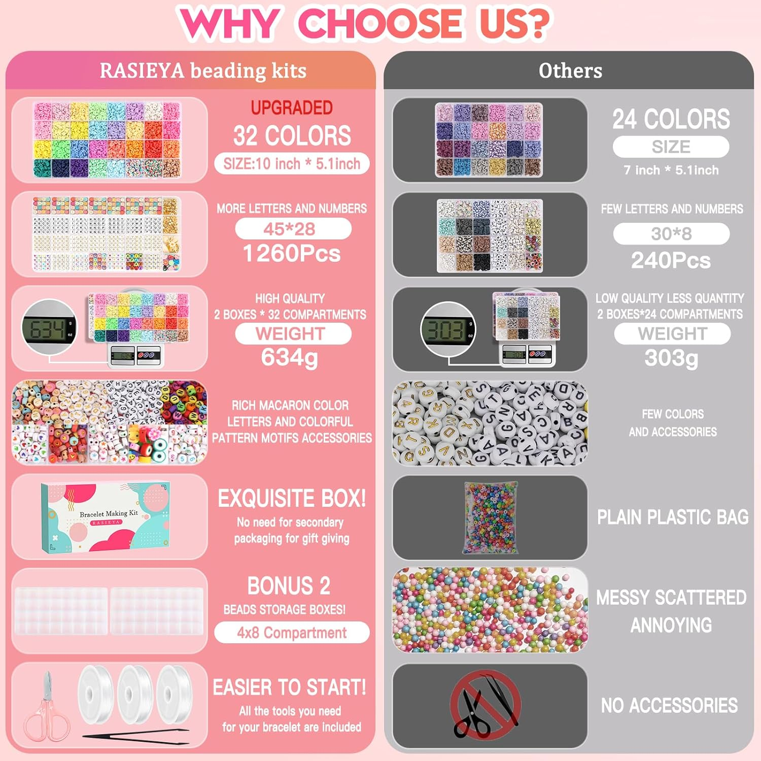 【Upgraded Complete Configuration - Meet All Your Needs】 Our bracelet making kit is unique in the market, offering a wide range of styles and colors for you to choose from, so you can mix and match.2 boxes, including 6080pcs of 32-color flat clay beads, 1260pcs of A-Z letter beads, 0-9 number beads, patterned beads (heart beads, star beads, cross beads, and peace beads), and a variety of spacer beads, pendants, shells, polymer clay beads and other ornaments. Also provided are 3 coils of elastic string, 1 pair of scissors and 1 pair of plastic tweezers. 【Valentines for Kids Classroom】Making DIY bracelets is a fun and creative Valentine’s Day activity for kids (Ages 6 and up) in the classroom! This craft allows children to create personalized Valentine gifts for friends and classmates, fostering creativity and hands-on skills. It’s a wonderful way to celebrate friendship and kindness, as students can exchange their handmade bracelets and share heartfelt messages. Not only does it promote teamwork and sharing, but it also creates lasting memories that kids can cherish and even share with their families! A perfect way to spread love and joy in the classroom this Valentine’s Day. 【Perfect Gift】 Handmade gifts often express personal feelings the best! Buy one now! You can either give the bead bracelet kit directly as a gift to DIY lovers, or you can make different bracelets by yourself to give people at special times such as birthdays, anniversaries, festivals(such as Valentine's Day, Halloween, Christmas Eve, Christmas Day), etc., so that the bracelet can connect with each other's emotions. Compared with other products, our bracelets kit is better in terms of color, style, quantity, quality and packaging,making the bracelet more beautiful! 【Ideal Fashion Accessories】This clay beads bracelet making kit is not only suitable for making bracelets but also for making necklaces, anklets, waist chains, cellphone chains, purse pendants,etc. The beads for bracelets provided in the bracelet kit not only follow current popular colors but also have smooth edges, clear holes, and non-fading surfaces, making the final product perfect for beach outings and shopping trips. 【Friendship Bracelet Making Kit】Swapping friendship bracelets has become an essential activity for fans at concerts. On the bracelet, you can use alphabet beads and number beads to spell out any meaningful words such as album name, song title, lyrics, person's name, birthday and other meaningful words. And then play to the imagination to add pattern beads, flat clay beads, gold spacer beads and other accessories to make a one-of-a-kind friendship bracelet. Each bracelet with friendship bracelet beads carries a symbol of the fans' love for the singer and their goodwill towards each other! Product Description