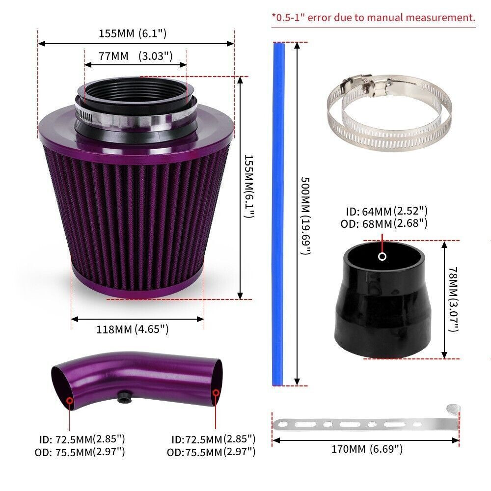 Description: 【Premium Material】The air intake pipe made of excellent aluminum alloy material, high temperature resistant and anti-corrosion, ultra durable. 【Designed To】Funnel-shaped air intake hose designed to direct cold air inward, minish intake turbulence, boost air speed and generate. 【Good Performance】The cold air intake hose helps to optimize throttle response, creating pure horsepower and improving fuel / gas mileage. 【Practical Tool】Air filter adopted dry density fibers which can obstruct external substance entering the engine, it is a practical tool. 【Widely Application】Universally fit for vehicles with air intake hose diameter at 76mm / 3 inch, also applicable to air intake systems on modified vehicles. Comes with all necessary mounting hardware for easy installation. Specifications: Filter Types: Intake System Replacement Filter Filter Shape: Round Tapered Diameter of Pipe: 3IN Size of Joint Pipe: 3IN to 2.5IN Material: Aluminum Alloy Used to a wide variety of applications including racing vehicles, radio-controlled cars, generators, snowmobiles, tractors, and other applications. Please be sure to check the size of this product carefully before ordering to avoid unusable. Packing Included: 1 x Air Intake Pipe 1 x Air Filter 1 x Hose 1 x Mounting Bracket 1 x Joint Pipe 2 x Clamp All accessories on the picture are included. Note: 1. If you has any problem, please feel free to contact us. 2. Please let us know before you send us the neutral/negative feedback that wont help to finish the issues. And I will definitely try my best to provide the best solutions which would meet your satisfactory. Payment Delivery details Return Policy About us Contact us Payment We will only ship to eBay confirmed shipping addresses. It is buyer responsibility to provide correct shipping address before purchasing. Buyer is responsible for any reshipping cost due to wrong or undeliverable addresses. Delivery details Items are shipped within 1-2 business days of receiving payment verification. Domestic shipping fees are applied to the lower 48 Continental States only (AK, HI, GU, PR, VI, Base Addresses, may require additional shipping cost) Please e-mail us for a shipping quote. INTERNATIONAL shipping available through eBay's global shipping. But Buyer might pay some VAT and Duties; seller is no responsible with any VAT and Duties. Deliveries are generally done within 3-5 business days nationwide and 10-20 days worldwide. Damaged item due to shipping must reported to us within 48 hours of delivery in order to place claim with shipping company. Return Policy No returns or exchanges once item has been installed, used or modified. We will exchange the item only if is defective or if customer receive the wrong parts. Returns and/or exchanges must be done within 30 days from delivery date. All returns and/or exchanges must be in brand new/uninstalled condition. About us Always Free Shipping with your Parts orders. Lowest price on brand new, in-the-box auto parts. Business time is Monday - Saturday 8:30 am to 5:30 pm HKT except all Holidays. Contact us Always Free Shipping with your Parts orders. Lowest price on brand new, in-the-box auto parts. Business time is Monday - Saturday 8:30 am to 5:30 pm HKT except all Holidays.