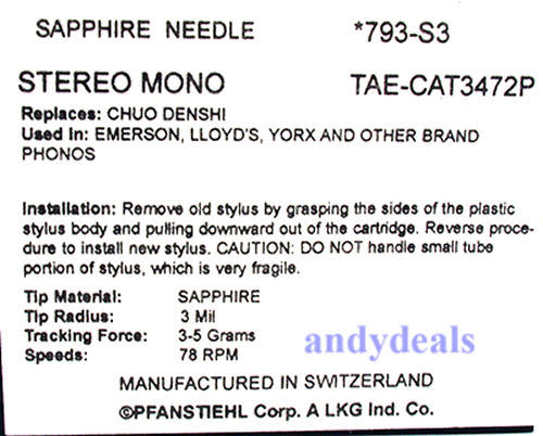78 RPM 793-S3 PHONOGRAPH NEEDLE FOR CROSLEY NOSTALGIA OTHERS QUALITY SWISS MADE! Model Pfanstiehl 793-S3 fits Crosley & Nostalgic Turntables For 78 rpm records Description Brand New (factory box) replacement stylus tracking force 3-5 grams Sapphire .3 mil tip needle Speeds: 78 RPM REPLACES needles listed below NEEDLE S FISHER ST-05D ST05D ST-141 ST141 ST-707J ST707J JC PENNEY 6-2339-1 623391 MAGNAVOX 5690300007 483525197005 PANASONIC CZ-800 CZ800 SANYO ST-707J ST707J ST-05 ST707J ST707J ST05 SHARP STY-146 SONY ND-152P ND152P TECHNICS CZ-800 CZ800 CARTRIDGES DENON SJN-68 SJN68 JC PENNEY CARTRIDGES 1259-4909 12594909 1260-9269 12609269 CZ-800-1 CZ8001 PANASONIC CZ-800 CZ800 SHARP 146 SONY VX-52G VX52G TECHNICS CZ-800 CZ800 MODELS ACADEMY MD1101 ALBA DL501 MC452 MS1050 MS1250 MS1450 MS150 MS1700 MS450 MS700 (CD) MS800 SST1820 SST1900 SST2000 SST2300 SST2400 SST2900E Z208 AMSTRAD M845 SG33 Studio100 TM71 TS46 TS77 BINATONE 1044 1054 7232 7280 Melody Mk3 Midi 110 Midi 140 BSR 6-2339-1 623391 CZ-800-1 BUSH 8830/5 8850 9530 9541 9546 9547 9561 9580 9582 9827 9842 9901 MS200 MS210 MS220 MS230 MS240 MS250 MS835 CROSLEY NOSTALGIA PHONOGRAPHS CR-27, CR-43, CR-44, CR-46C, CR-47, CR-48C,CR-49B, CR-49TW, CR-50TW,CR-53, CR-67, CR-69, CR-70, CR-73, CR-77CD, CR-78CD, CR-79, CR-711, CR-712CD, CR-86, CR-87CD CROWN CD2000 MZ1100 MZ2150 EMERSON M4000 CD1330P CD1435P CD1453 MC1550 MC2293 AS2610 AS2650 MS4000 AS2600 AS2603AS2803 AS2806 AS2809 CD2000 CD2500 FISHER GT747 GXT1707 GXT707 GXT747 ICS716 MC617 MC715 MC715B TAD102 GE CS3000 CS-3000 CD 3000 GOLDSTAR GCD82P GSM6310 GSM6920 GSMX2 GRAND PRIX R6300 R6400 R6500 S4000 S5500 S5800 S7000CD HITACHI HTMD10 HTMD30X SMD10 SMD100 SMD30 SMD40 SMD400 T08 T30 MAGNAVOX AS305M3701 MX1810 BK01 PHILIPS 1462 1465 1650 1651 1652 462 F1275 F1485 F1662 F1664 F763CD FCD185 FCD285 FCD462 FCD463 FCD465 FCD485 FCD560 FCD562 FCD563 FCD565 FCD585 S1652 SCD652 PIONEER S-100 S100 S-200 S200 X-1100 X1100 X-2100 X2100 X-4100 X4100 X-6100 X6100 X-7100 X7100 X-9100 X9100 RADIO SHACK Clarinette122 13-1327 SPIRIT OF ST. LOUIS NOSTALGIC SANYO GT1707 GT1707 1747 GXT-747 GXT747 GXT-210 GXT210 GXT707 GXT747 SOUND DESIGN 6822B 6822-B 35871BP5 5856PK6 5868CD2 5868CDP 5868PK6 5868TM4 5869BP3 5869SP1 5871BP5 5871BPJ 5871SK1 5966PK6 5967BK6 5975BP9 5979M4D 5979PK2 5990CDP 5990M4D 5991BPPl 5991SP3 5994PK8 5995PK-4 5995PK4 6822-17 682217 6822BK4 6822BP4 6822PK3 6822PK6 6822TT1 6822M17 6822HK4 6856-56 685656 6857-57 685757 6857BK2 6857MP2 6868-68 686868 6868ACD 6869-69 686969 6966-62 696662 6967-67 696767 6971-71 697171 YORKS ELECTRONICS (YORX) M2408 M2409 M2676 M2202 M2203 M2408 M2409 M2501 Q802A STX8000 2409 STX500 M4900 M5000 R4210 R4212 R4116 R4121 R4125 R4106 R4109 R4110 Q/100 Q101 Q200 M5106 M5116 M5121 M8107 This ad is for one 78 rpm stylus.