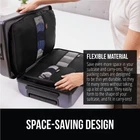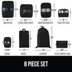 Description SAVE UP TO 50% MORE SPACE IN YOUR SUITCASE The Packing Cubes let you easily compress, organize, and separate each type of clothing when you pack and travel. The space saving and flexible fabric allows you to neatly pack a suitcase and carry on without worry of items not fitting so you can make full use of your luggage space . SLIP RESISTANT ZIPPERS FOR MAXIMUM COMPRESSION The Packing Cubes feature 2 way, slip resistant easy pull zippers that make zipping the bags seamless and easy. The additional compression zippers flatten the packed cubes further into a thin space saving size Plus, organizers feature a drawstring closure for the laundry bag. DURABLE TO WITHSTAND FABRIC BREAKING The Packing Cubes are meant to last trip after trip. The Cubes feature durable 210T polyester material that resists breaking for long lasting use. MULTIPLE PACK SIZES The packing cubes come in a 3 piece and 6 piece set to accommodate all size clothing, shoes or toilettries for suitcases and backpack. HELP REDUCE WRINKLES The Cubes are not just designed to help organize your clothing, the packing cube set also help protect items from wrinkles so you can keep items organized and looking great. Your clothing will come out just as perfectly as it goes in. SAVE MORE SPACE IN YOUR SUITCASE: make travel easier than ever; the Packing Cubes let you easily and effectively organize and separate each type of clothing together; neatly pack a suitcase without worry of items not fitting in your carryon or suitcase; make full use of your suitcase space; plus, the flexible material lets you fit them into any suitcase without taking up too much space, even in carry-ons DURABLE CONSTRUCTION WITH GRIPPY ZIPPERS: packing cubes are meant to last trip after trip; durable 210T polyester material is tear resistant; also features 2 way, slip resistant easy pull zippers that make zipping the bags seamless; drawstring closure for the laundry bag BREATHABLE MESH WINDOW: each packing cube features a mesh window that allows you easy visibility into your items; allows your clothing to breathe to help reduce odors and keep your clothing staying fresh 8 PIECE SET: this 8 piece set features cubes for heavy items like jackets and sweaters, but also cubes for smaller lightweight items like shirts and undergarments; a laundry bag and shoe bag are included to keep dirty items away from the clean; also comes with a toiletry bag and accessory bag for small personal items HELP REDUCE WRINKLES: not just designed to help organize your clothing, the packing cubes also help protect items from wrinkles; keep items organized and looking great; clothing will come out just as perfectly as it goes in; also a great option to store your clothing in drawers
