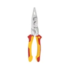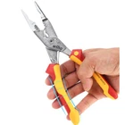 8 in 1 Insulated Pliers 1000V VDE Snip Nose Wire Stripping plier Multifunctional Electrician hand Tool 45489 FEATURES All products in our shop are original and genuine 8-in-1 Functionm:Clamping, fastening, bending, shearing, crimping, wire stripping, deburring, cutting Slender pliers for easy operation in narrow spaces C70 high carbon steel material,The cutting edge has undergone induction hardening treatment, with a hardness of up to 64 HRC,Surface chrome plating for corrosion resistance and durability VDE, GS dual certification, can be used on live equipment up to 1000V AC Parallelogram clamping mouth,Perfect fit to the shape of the nut for tighter clamping Extended clamp head design,The length from the clamping position to the end of the handle is 21cm,The force arm length during twisting is super labor-saving Extra wide handle design, comfortable to hold, reasonable soft and hard area settings, curved end design to prevent slipping The opening spring can be switched to keep the opening rebound after opening. The jaws can be completely closed in the natural state for easy storage. NOTE Cutting diameter: 5x 2.5 mm2 or 15 mm copper or aluminum wire Stripping diameter: 0.75 mm2, 1.5 mm2 and 2.5 mm2 Crimping range: 0.5-2.5 mm2 Cut-off diameter: Maximum can be used for m3 screws (maximum screw diameter 3.3mm) The sizes of insulated pliers were checked by hand, please allow 0-10mm error and make sure you do not mind before you order The pictures or videos may not reflect the actual color of the product due to the different monitors