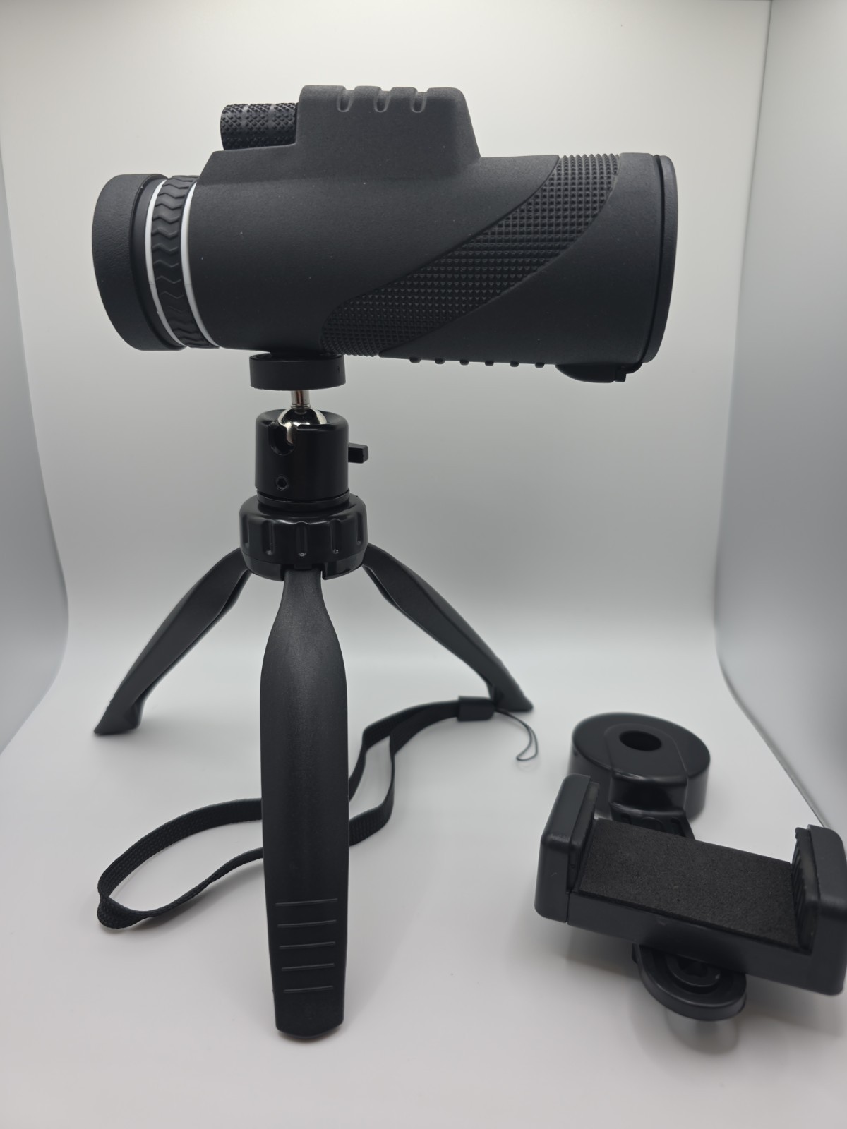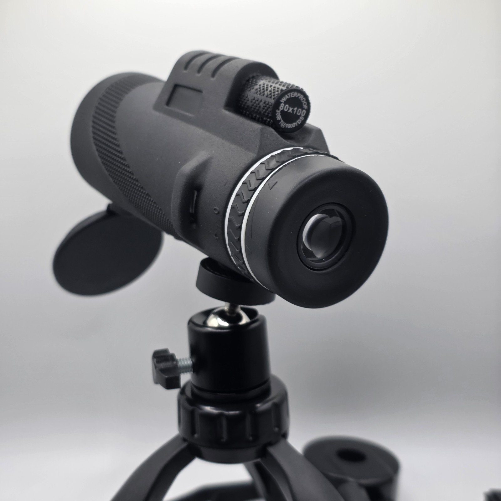 High Power 80x100 HD Monocular Telescope Perfect for outdoor activities such as hiking, bird watching, hunting, sports events and travel. Features: • 80x100 Marked Magnification • Waterproof design • Mini tripod included for stable viewing • Smartphone holder adapter included • Portable carry case • Cleaning cloth included • Lightweight and compact Condition: New Ships fast from USA.