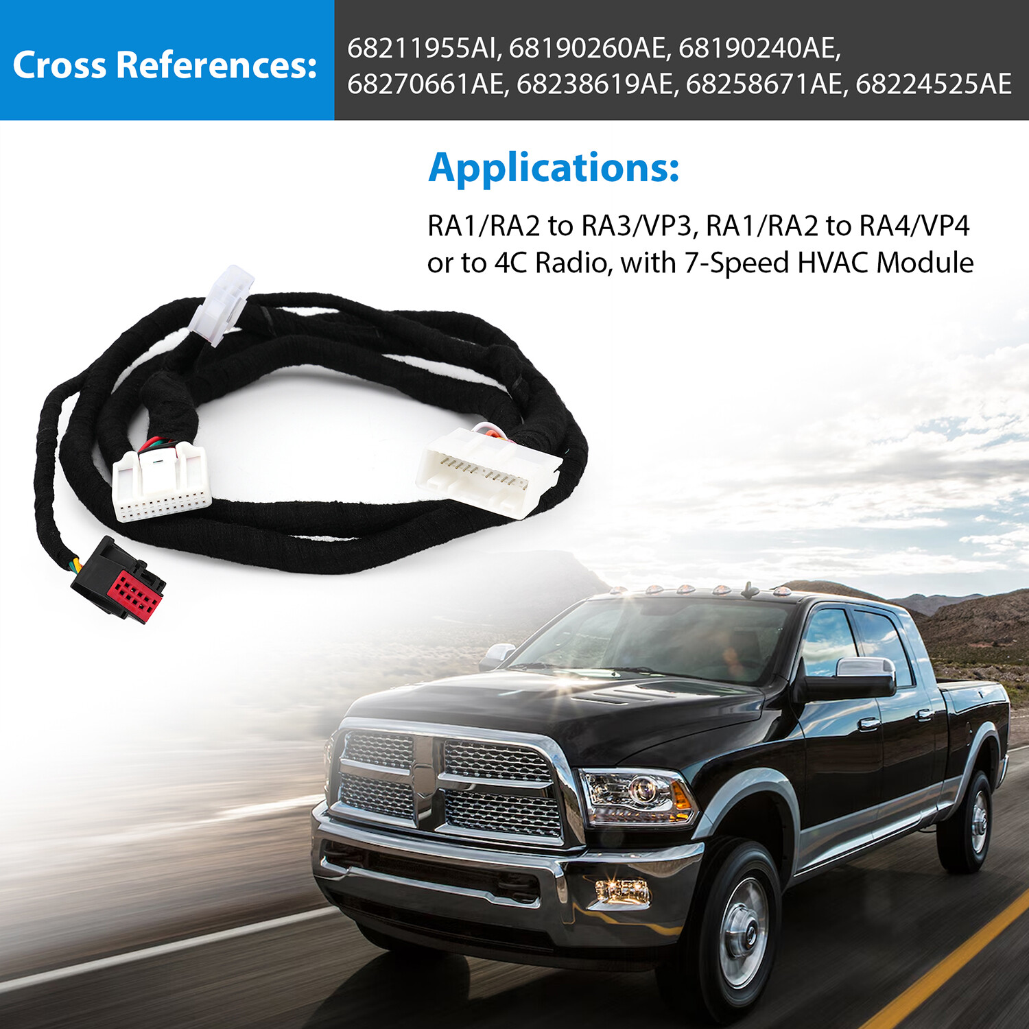 8.4" UConnect Upgrade Conversion Harness For Ram 1500 2500 7-Speed Item Specifics Part Type: Radio Conversion Upgraded Harness Fitment Type: Direct Replacement Connectors: 24 Pin, 8 Pin Cross References: 68211955AI, 68190260AE, 68190240AE, 68270661AE, 68238619AE, 68258671AE, 68224525AE Applications: RA1/RA2 to RA3/VP3, RA1/RA2 to RA4/VP4 or to 4C Radio, with 7-Speed HVAC Module Connections: 24 Pin Connector: Plugs into truck side 24 pin connector 8 Pin Connector: Plugs into back of new 8.4 bezel Other Connectors: Plugs into center stack area Fits Upgraded Radio Models: UAQ: 8.4 inch touchscreen GPS navigation UAS: 8.4 inch touchscreen RA4: 8.4 inch touchscreen GPS navigation RA3: 8.4 inch touchscreen UAG: 7 inch touchscreen Description: · Fits for customer already has radio, bezel and HVAV module(7-speed fan), needs a conversion harness · Allows upgrade RA1 RA2 to a 4th generation 8.4 inch RA3/VP3, RA4/VP4 or 4C radio for Ram trucks equipped with a 7 speed fan HVAC module · Compatible with 8.4 inches radio models: UAQ(w/ nav), UAS(non-nav), RA4(w/ nav), RA3, UAG · 24 pin connector plugs into the truck side, 8 pin plugs into back of new 8.4 bezel, plug and play · For Ram 1500 2500 3500 2013-2018, for ram 1500 Classic 2019-2023 Fitment: 2013 For Ram 1500 2013 For Ram 2500 2013 For Ram 3500 2014 For Ram 1500 2014 For Ram 2500 2014 For Ram 3500 2015 For Ram 1500 2015 For Ram 2500 2015 For Ram 3500 2016 For Ram 1500 2016 For Ram 2500 2016 For Ram 3500 2017 For Ram 1500 2017 For Ram 2500 2017 For Ram 3500 2018 For Ram 1500 2018 For Ram 2500 2018 For Ram 3500 2019 For Ram 1500 Classic 2020 For Ram 1500 Classic 2021 For Ram 1500 Classic 2022 For Ram 1500 Classic 2023 For Ram 1500 Classic Payment Delivery details Terms of sales About us Contact us Payment Paypal Preferred. Delivery details · USPS Standard Shipping. · Order processing: within 1 business day upon payment(excluding holidays and weekends). · Shipped from: US Warehouse Terms of sales · Please read the item description and check the pictures carefully before ordering. · Return or refund is available only if item DOA or there's error in item description causing the item not fitting the need. In such cases, seller pays for all related shipping cost. · Returns are also acceptable if buyer purchased this by mistake and item is still in good condition for reselling. Buyer is responsible for all related shipping cost. · Buyer need to file an application for return within 60 days after receiving the item. Items returned must be still in good condition as they were received. Return notes: 1.Please contact us for return and we will proceed with following instructions. 2.Returning the package with a tracking method, like USPS. The RMA#(Return Merchant Authorization Number=Your ebay ID) must be clearly written on the return package, otherwise the package will be refused. 3.Email us the return tracking number. 4.All returns will be inspected prior to a credit being issued. About us We are specialized in auto parts accessories for many years and we also sell items on ebay for several years. If you have questions about our items and services, please kindly feel free to contact us, we will try our best to satisfy you within 24 business hours. Contact us Please be free to email us by clicking the "Asking a question" link, once there is any pre-sale or after-sale inquiry for our items. We will email back in 24 working hours. If you'd like to put a neutral or negative feedback, or open the ebay or paypal case, please email us so we could try our best to resolve the issue.