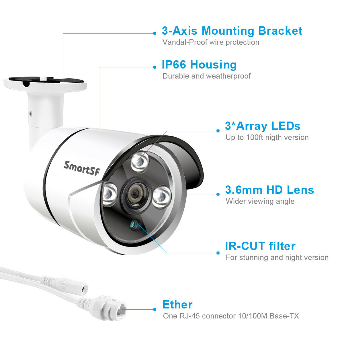 SmartSF 8 Channel 5-Megapixels 2560*1920P Outdoor PoE IP Security Camera System Features: 【Super HD 5-Megapixel High Resolution】 5.0MP IPG5520-F with a pixel resolution of 2560x1920, that is, nearly 2.4X the resolution of 1080p Full HD, and even 1.3X the resolution of 1440p. It sees and records your home security more clearly, with more details. 【Excellent Night Vision, Up to 100ft】 Great cameras aren't just measured by images in daytime. SmartSF 5.0MP security camera kit stands out for its incredibly excellent images at night. Infrared LEDs enable long night vision distance (up to 100ft). Captures crystal clear video evidence of theft and vandalism that occur in low-light conditions. Reliable Solution for Home, Business and Projects. 【Waterproof Works Perfectly Outdoor/Indoor】 The 4 Bullet cameras 5.0MP IPG5520-F have solid aluminum bodies and housing, with an IP66 waterproof rating. So you can feel free to install them outdoors, like in your garage, backyard, or anywhere else. It can stand harsh weather conditions, including rain, snow, intense cold and heat. Rain or shine, hot or cold, these cameras never quit. 【PoE–Easy Setup, Eve n for a Beginner 】 A real plug and play security system! It features PoE (Power over Ethernet), with a single network cable connecting each IP camera to the NVR for both power supply and video signal transmission. Easy wiring – the wiring process can’t be simpler for DIY enthusiasts and beginners. 【Remote Viewing, Anytime, from Anywhere】 No matter where you are, you can remotely access the security camera to see live streaming and stay connected. Remotely view the IP camera via free “IP Pro” App on your mobile device, free “E-see Net” CMS Client on your computer, web browser. Even when you are in your office or travelling, you can check what's happening to your home/business on the go. PoE Network Video Recorder Specifications: IP Video Input: supports 4 IP cameras Video Output: Monitor or HDTV via VGA, HDMI Compression Format: H265+, H.265 and H.264 Playback: 4 cameras play simultaneously HDD: Not included HDD Capacity: 1x internal SATA port, up to 6TB Power over Ethernet Sockets: RJ45 x 4 USB Port: 2x USB 2.0 (mouse control, backup, firmware upgrade) Remote Access: iPhone, Android Phone, Windows PC PoE IP Camera Specifications: Image Sensor: 1/2.8" CMOS Sensor Effective Pixels: 2560 x 1920 (5.0 Megapixels) Frame Rate: Main Stream@25fps, Sub Stream@6fps Day & Night Vision: Auto / Color / BW Output Interface: RJ45 Operating temperature: Up to +60℃ What’s In Box: 1x 8CH 5MP NVR 1x 4pcs 5MP cameras 1x USB mouse 1x DC 48V3A power supply for NVR 4x 18m network video cable for IPC 4x Screw kit for IPC installation 1x User manual