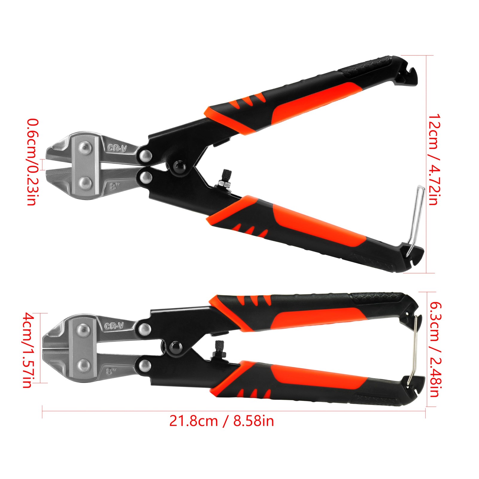 Specifications Material: Steel+ABS rubber coating Size: As shown in the picture The package includes 1 x Mini bolt cutter: 8.66 "/22cm long, 2.56"/6.55cm wide Blister cardboard packaging Kind reminder Manual measurement, please allow for small size errors. Due to different screens, there may be slight differences in color. Please understand Warning: Due to the sharp edges of the pliers, please avoid using or coming into contact with children under 18 years old Mini bolt cutter, with rust proof oil layer on the surface, is a normal condition 1、Duty mini bolt cutter. Our small bolt cutter is made of chrome vanadium steel, with a sharp blade and a maximum cutting capacity of 2.5mm (3/23in). 2、Portable with anti slip handle. Our mini bolt cutting machine has a small volume and is easy to carry. It is designed with a soft anti slip handle, making it easy to operate with one hand. 3、Anti rust bolt cutting pliers, these heavy-duty bolt cutting pliers have anti rust black coating and are durable. (There is a rust proof oil layer on the surface of the product, which is a normal situation.) 4、Mini bolt cutting machine is very suitable for cutting small bolts, screws, and invisible steel wire mesh on balconies. We do not recommend using this small bolt cutter to cut locks, padlocks, iron chains, steel bars, etc. that are too large or super strong. 5、The maxi cutting capacity is 2.5mm (3/23in), the length of the mini wire cutting pliers is 22cm (8.66in), the blade length is 5.5cm (2.16in), and the width when closed is 6.5cm (2.56in)