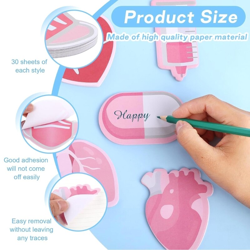 These medical-themed sticky notes are a game-changer! Perfect for nurses, students, or anyone who loves a fun, organized workspace. The adhesive holds well, the size is just right for quick notes, and the cute designs add personality to reminders. Great for labeling charts, jotting down med schedules, or leaving messages—super handy and practical!
