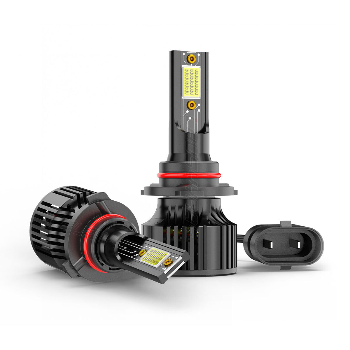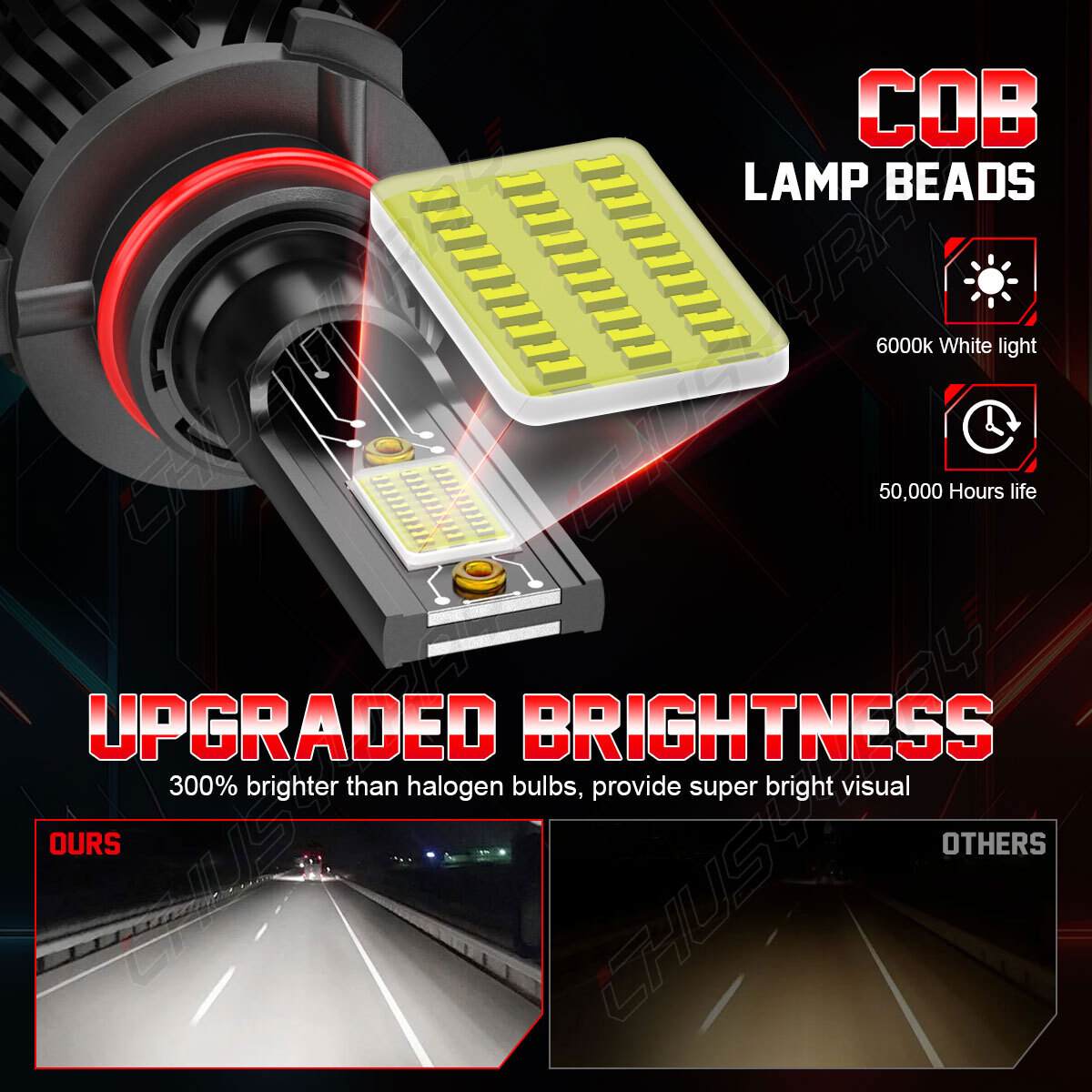 Features SUPER BRIGHT : 100W, 36000LM per pair with stronger, more concentrated light output, 600% brighter than the original halogen bulbs, allowing you to see more clearly when driving at night. OPTIMAL BEAM PATTERN : Our LEDs have the same beam pattern as the halogen bulbs with a clear cut off line, without any dark spots or shadow areas and no glare to oncoming traffic. 5 - M INUTE INSTALLATION : All-in-one design, bulid-in driver for taking up less space in housing, no bulky external driver, no extended bulb base, no more modification on housing or cover. Real plug and play, smoothly fits into vehicle's housing and factory sockets even with limited space in original housing. LONG LIFESPAN : The efficient cooling system with integral aerospace aluminum body, unique hollow engraved heat sink design and smart IC ensures a longer life for the LED conversion kit. Specifications: Bulb Size : 9005/HB3 Usage : High Beam Package includes : 2 Bulbs Voltage : DC 9-16V Light Power : 100W/set (50W/bulb) Luminous Flux : 36000LM/set (18000LM/bulb) Color Temperature : 6,000K Xenon White Lifespan : Over 50,000 hours Certification : IP67 Waterproof, CE, RoHS NOTICE: 1. This product is polarized, with positive (+) and negative (−) symbols on the plugs. If it doesn't work, try reversing the plug and inserting it again. 2. Our LEDs are designed to replace halogen bulbs only and will not fit vehicles with factory LEDs or HIDs.