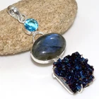 925 Silver Plated Fiery Labradorite Titanium Druzy Long Pendant 2.7" JW