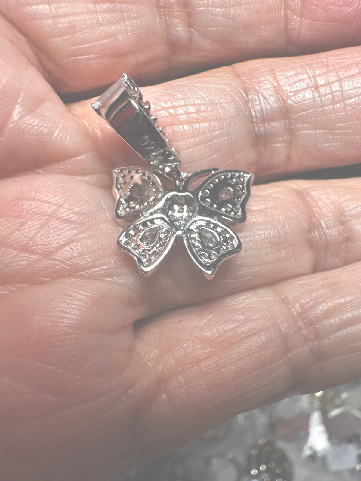 This stunning pendant is perfect for any occasion. This butterfly pendant features sparkling cubic zirconia stones and delicate bagettes on the hanging area. The pendant is made of 925 sterling silver and is designed to last. This piece is perfect for those who love butterflies and want to add a touch of elegance to their outfit.