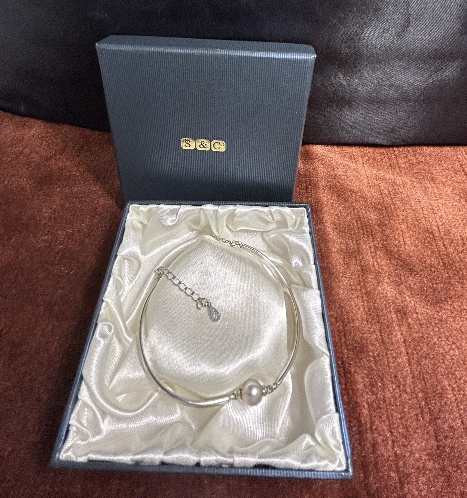 This stunning bracelet is made of 925 sterling silver and features a beautiful freshwater pearl. The adjustable size chain detail ensures a perfect fit for any wrist size. The lobster closure adds security for your bracelet. Its white pearl main stone colour and chain and bangle style make it a versatile accessory for any occasion. This beautiful piece is a must-have for any jewellery collection. Complete with pre-loved gift box.