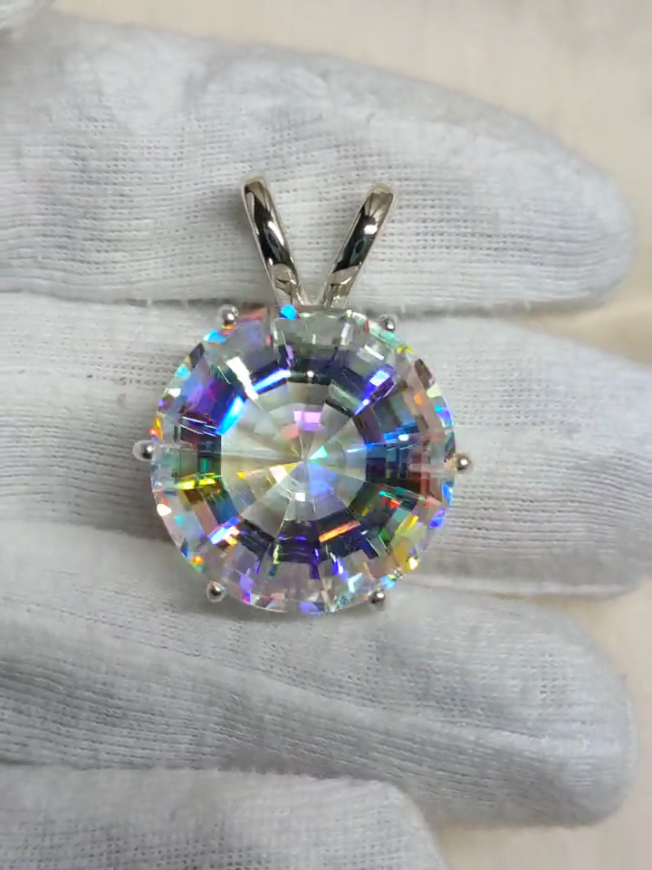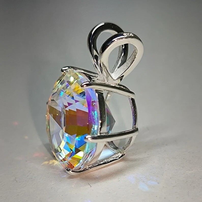 Stunning 21mm Mystic Topaz Pendant – Brilliant Faceted Cut – 925 Sterling Silver – Art Deco Style Add a burst of color and meaning to your jewelry collection with this dazzling 21mm Mystic Topaz Pendant , beautifully set in high-quality 925 Sterling Silver . The expertly faceted round cut showcases an array of rainbow flashes that shift with every movement, making it the perfect statement piece for those who love jewelry with personality and purpose. ✨ Key Features: Gemstone: Genuine Mystic Topaz (Rainbow Flash) Cut: Brilliant Round Faceted Stone Size: 21mm Metal: Solid 925 Sterling Silver Setting: Secure 6-prong claw setting Finish: High-polish silver for lasting shine Style: Elegant Solitaire, Art Deco-Inspired 💎 Stone Benefits: Encourages emotional balance and clarity of mind Promotes intuition, positivity , and spiritual alignment Believed to offer protection from negative energy Associated with the Crown and Heart Chakras Whether you're drawn to its healing properties or simply its breathtaking color play, this pendant is a radiant addition to any outfit. Ideal for energy work , meditation , or as a thoughtful gift for someone special. 🎁 Perfect for Birthdays, Holidays, Anniversaries, or a Magical Christmas Gift for Her!