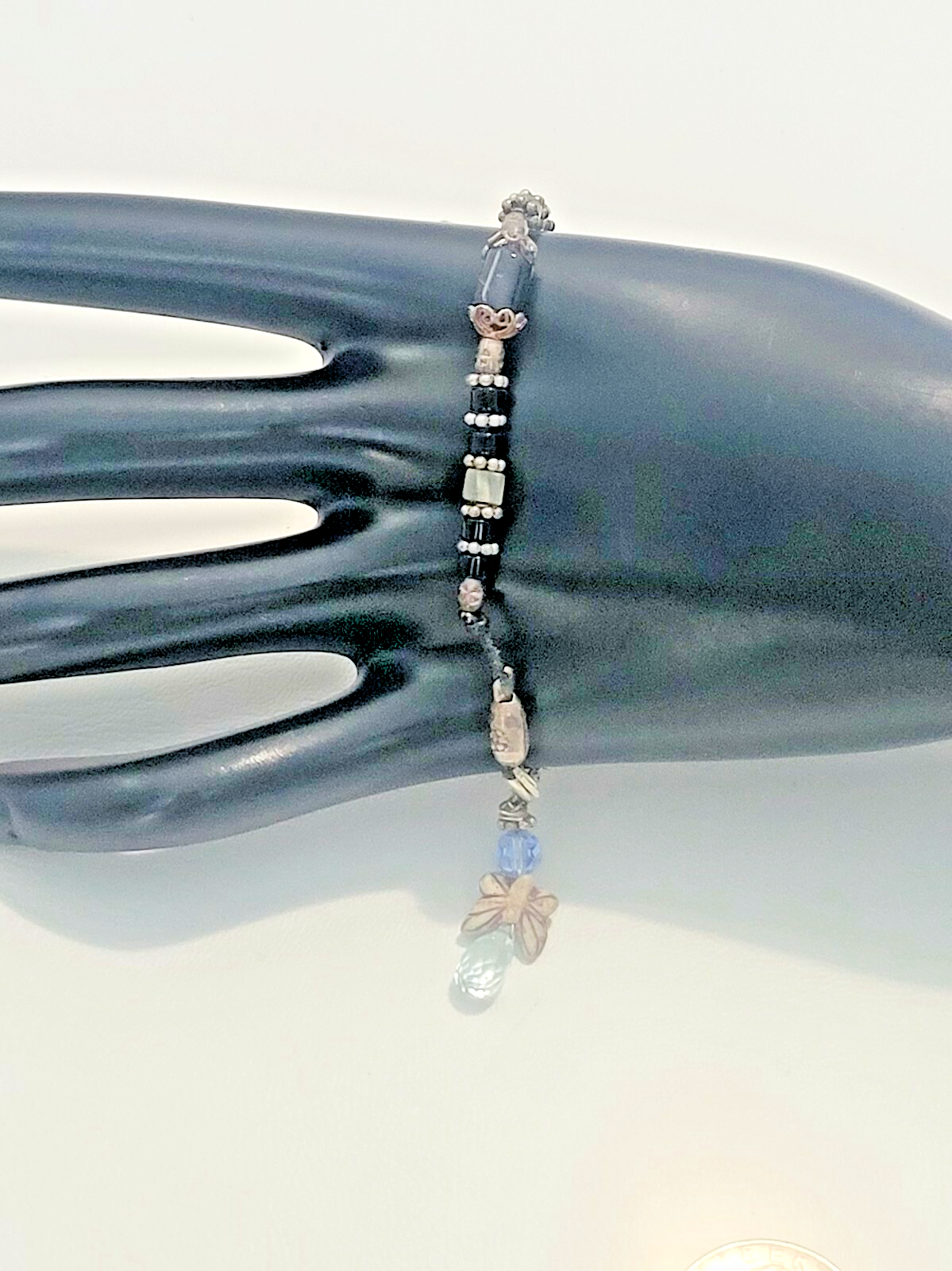 925 STERLING SILVER ONYX W/ TOPAZ BRIOLETTE DROP BRACELET ANKLET 5-9" 506 DECEMBER BUTTERFLY BOHO SOUTHWEST ****************************** Thank you for your interest in our jewelry. We'd like to introduce ourselves. We are just a retired couple who love matching our customers with great jewelry. We're not professional jewelers. To have the best shopping experience we like to recommend the following: Please measure your hand, wrist, finger or neck to ensure the best fit. We can use your measurements to help with sizing. Please ask all the questions you want. We know some stuff and, if we don't, we'll do the research. We like to learn too. More Stuff: If an item is described as "gold over 925 sterling silver" this means it is gold vermeil. Vermeil is the process by which a layer of gold (usually 14k or 18k) is bonded to sterling silver. We only clean with gentle soap and warm water to avoid damage. The items we sell may be new or pre-owned and may have normal wear, slight damage, and/or tarnish. We make every effort to ensure the items we sell are as described. This includes testing to confirm metal purity if the item isn?t marked, and testing for gemstone identity. We try to put measurements in the jewelry description and include a photo of each piece with a U.S. quarter (25mm).