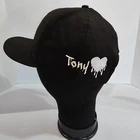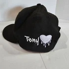 9Fifty New Era LA Dodgers Trucker Snapback Hat LA Emblem Black on Black 100% wool. There is an embroidered name Tony and heart on the side of the cap.