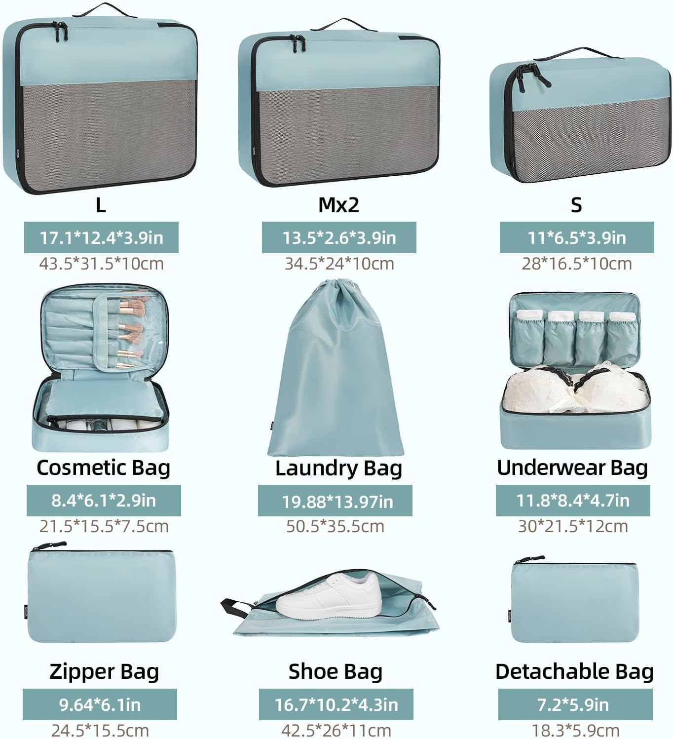 Fast Shipping Great Customer Support Satisfaction Guaranteed DESCRIPTION Shipping Shipping Shipping All domestic packages are shipped for Free (Unless other shipping method was selected during the checkout) Most items ship and arrive much sooner than the estimate delivery date. Usually within 2-3 days from payment. However, we have longer estimates to compensate for the occasional delay or supply chain breakdown. We do not accept P.O. BOXES - PLEASE PROVIDE A PHYSICAL ADDRESS Return Return Return In the event that you would like to return your purchase, we allow returns that are processed within the defined return date (the return date is to be found in the return policy/shipping and handling section) Please contact us for a return authorization and the return shipping address. Payment Payment Payment PayPal is our preferred method of payments it's the quickest, easiest and most secure way to pay for your goods or services online. PayPal offers buyer and seller protection should there be a problem. If you do not have a PayPal account, to get started and buy your first item with us is very easy. Simply click on the 'Buy It Now' button and follow the eBay checkout steps. Select PayPal as the payment method you then will be given the chance to enter your card details in to PayPal's secure checkout in order to pay for your order. Once the payment has been made, you will then be given the opportunity to make your own PayPal account to make paying for your items in the future very easy. Should there be a problem with payment please do let us know. Feedback Feedback Feedback Customer satisfaction is very important to us. If you have any problem with your order,please contact us and we will do our best to make you satisfied, please do not leave a negative feedback before we resolve your problem. We guarantee that your issue will be solved quickly. As long as you are happy with your purchase of , please leave us a positive feedback. Your feedback is very important to us it affects our search placement on eBay. We will leave a positive feedback for you in return automatically once we receive your feedback. Contact Us Contact Us Contact Us If you have any queries, please contact us via ebay. We usually respond within 24 hours on weekdays. Thank you for visiting our ebay store! STURDY and RUGGEDNESS: These Packing Cubs are Made of Premium Fabric, They are Very Durable and Tear Resistance, The Fabric Protects Your Clothes from Wrinkles and Stains while On The Go SEE-THROUGH: The Visual Panel Design Can Help You Identify Your Clothes to Avoid Fumbling Inside Your Entire Luggage; Saves Time in Finding items to Make Trip More Happy SPACE SAVING: Separating Your Different Clothes with Packing Cubes of Multiple Sizes and Vivid Color Options Available.Time-Saving for Your Traveling,Trip or Outdoors Activities; Make Full Use of the Space in Your Luggage MULTI-FUNCTIONAL: Fits Like a Glove into Most Airline Carry-ons, Tote Bags, Suitcases, Backpacks, Duffel Bags, etc. Great for Family Breaks, Business Travel, Vacation, Hiking, Camping, RV, Trip, etc Washing Instructions: To make the packing cubes last longer, it is recommend to wash them by hand with warm water and mild detergent, and then hang them to air dry; This will keep your cubes clean and tidy, ready for your next trip Packing Cubes Set for Travel - 9 Pcs Dusty Blue Luggage Organizers Click here to see description Fast Shipping Great Customer Support Satisfaction Guaranteed DESCRIPTION Shipping All domestic packages are shipped for Free (Unless other shipping method was selected during the checkout) We ship within two business days of payment, usually sooner Standard FREE shipping takes between 3-5 business days Expedited shipping takes between 2-3 business days Overnight shipping takes between 1-2 business days We do not accept P.O. BOXES - PLEASE PROVIDE A PHYSICAL ADDRESS We Ship Globally using ebay's GSP, the item is sent to a logistic center in KY and shipped from there to the rest of the world. International customers are responsible for all duties and taxes Contact your local authority for questions related to the amount of duties or taxes you will be responsible for Return In the event that you would like to return your purchase, we allow returns that are processed within the defined return date (the return date is to be found in the return policy/shipping and handling section) Please contact us for a return authorization and the return shipping address. Please contact us for a Return Merchandise Authorization (RMA) number. We advise you to use a reputable carrier service when returning your goods. Please pack all returns appropriately. We ship globally Via eBay's global shipping program (GSP). Thus we don't cover returns for items shipped globally. Buyers returning such items will be refunded ONLY for the item's cost and not for the shipping. please check the Voltage information and make sure it matches the one in your country. In case it's not stated in the description, do ask us. Payment PayPal is our preferred method of payments it's the quickest, easiest and most secure way to pay for your goods or services online. PayPal offers buyer and seller protection should there be a problem. If you do not have a PayPal account, to get started and buy your first item with us is very easy. Simply click on the 'Buy It Now' button and follow the eBay checkout steps. Select PayPal as the payment method you then will be given the chance to enter your card details in to PayPal's secure checkout in order to pay for your order. Once the payment has been made, you will then be given the opportunity to make your own PayPal account to make paying for your items in the future very easy. Should there be a problem with payment please do let us know. Feedback Customer satisfaction is very important to us. If you have any problem with your order,please contact us and we will do our best to make you satisfied, please do not leave a negative feedback before we reso