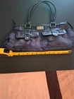 This Beautiful Vintage Nine West Purse is a classic black mottled satchel/top handle bag featuring a zip closure and silver hardware. Made of faux leather with a fabric lining, this purse has a detachable strap and inner pockets for organization. With a sleek design and timeless appeal, this handbag is perfect for everyday use or special occasions.
