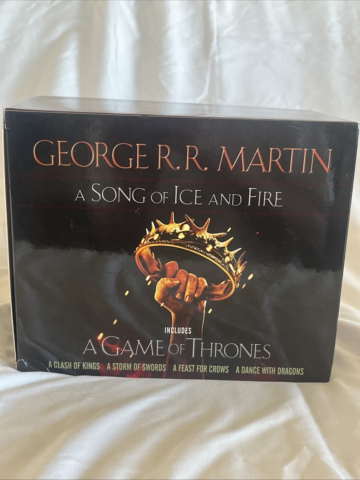 Immerse yourself in the epic fantasy world of Westeros with George R.R. Martin's A Song of Ice and Fire 5-book boxed set. This set includes all the books in the acclaimed series, featuring tales of intrigue, war, and dragons. The novels are in paperback format and published by Bantam Books. The boxed set is a great addition to any fantasy lover's collection and makes for a perfect gift. Join the ranks of fans who have been captivated by the world-building and complex characters in the series. Get your hands on this media tie-in edition and experience the thrill of the story.