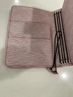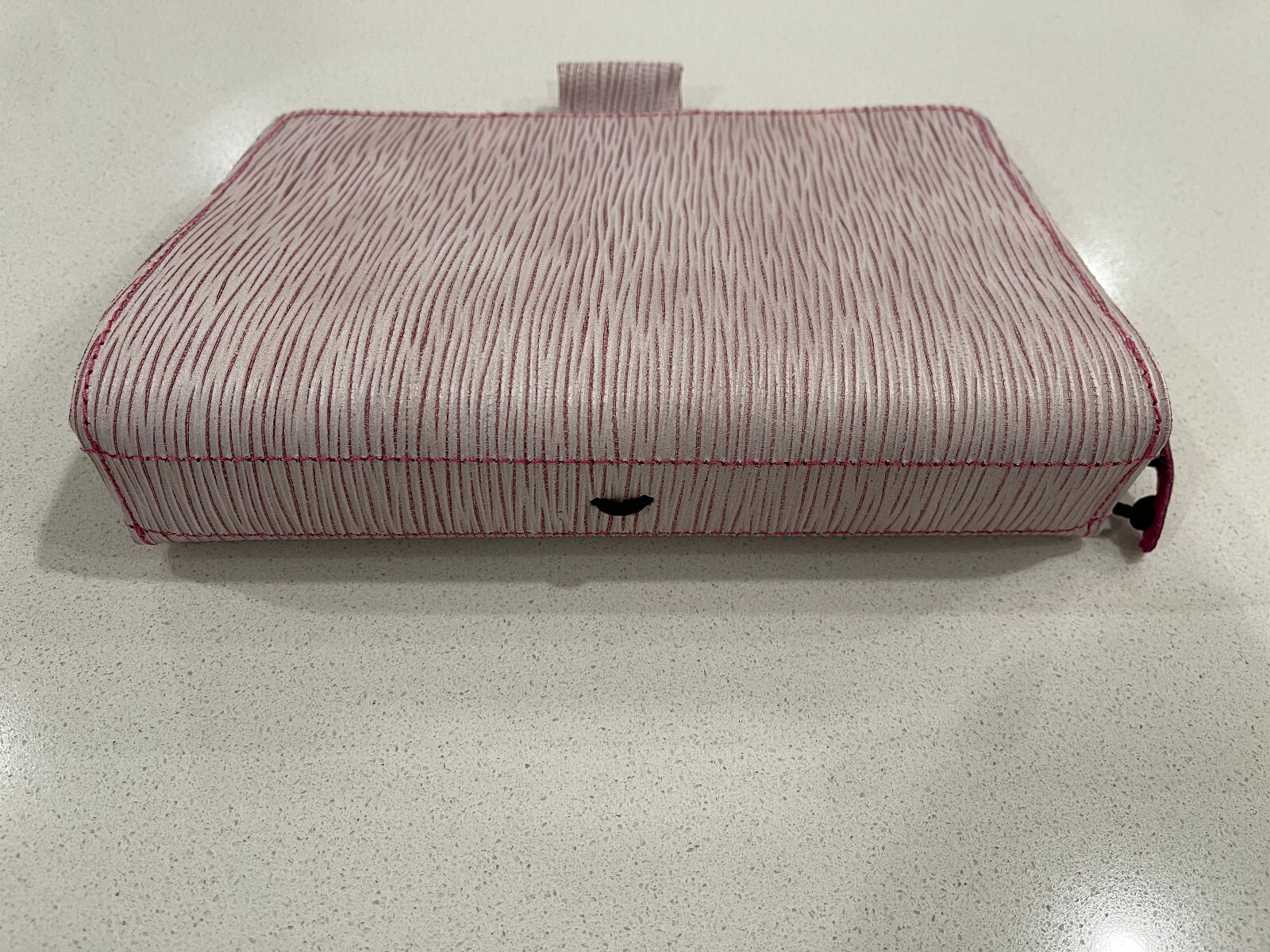 From my personal collection. This A5 Candy has held inserts and is in used condition. Please see all pictures. This is a one of kind piece. The Candy Traveler's Notebook features textured soft pink and mulberry toned, full grain American leather which has a slight gloss to the raised mulberry ribs and satin appearance to the soft pink background.