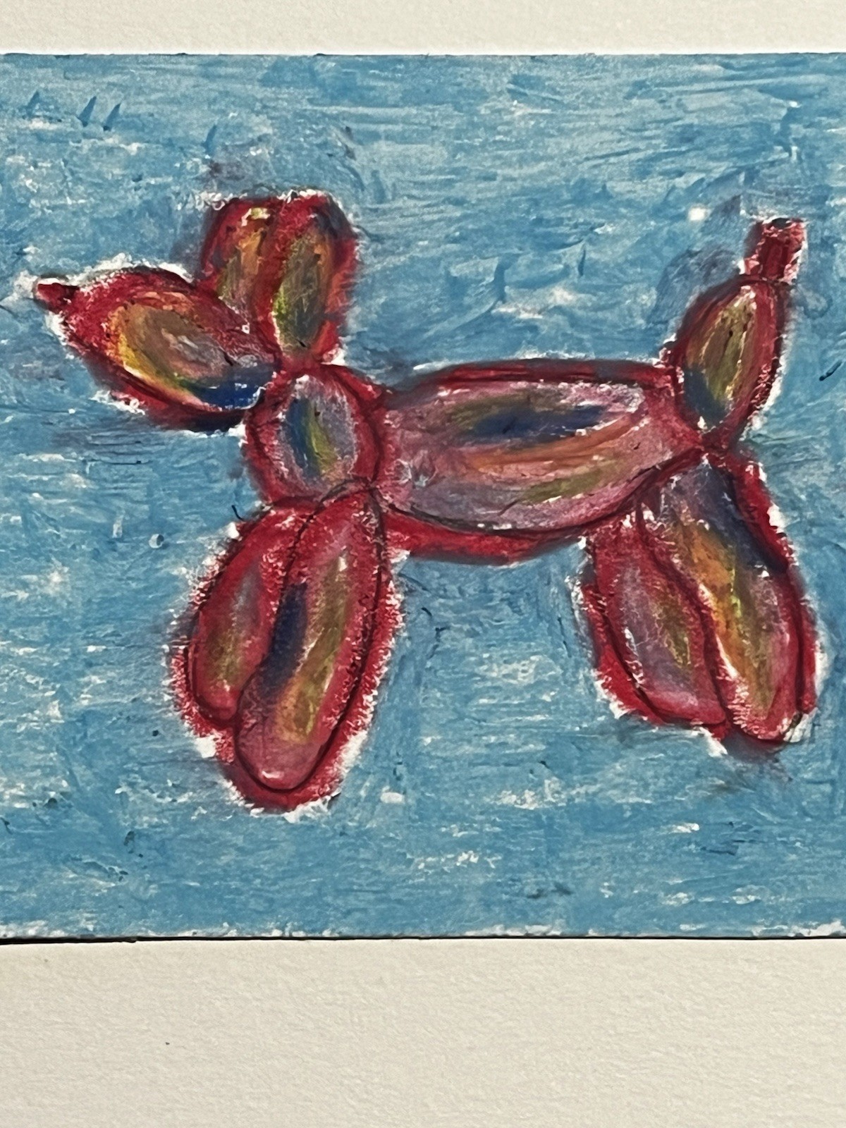 The ACEO Art Card featuring a Balloon Animal design is a small, original drawing made with oil pastel on paper. Measuring 2.5 x 3.5 inches, this ultra-contemporary piece showcases a pop art and expressionistic style. Handmade in Texas, USA, this unique artwork captures the theme of art in a fun and creative way, making it a perfect addition to any art collection or as a standalone statement piece. Made by: Angelina Rodriguez
