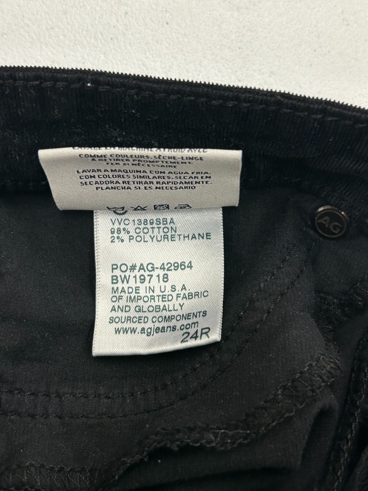 The AG Adriano Goldschmied Women's The Legging Ankle Super Skinny Black Corduroy 24R is a stylish pair of jeans perfect for women looking for a sleek and slim fit. Made from a durable blend of polyurethane and cotton, these corduroy jeans feature a zip closure, a mid-rise waist, and a 5-pocket design for added convenience. The ankle length and super skinny fit make these jeans perfect for a modern and on-trend look, while the black color and logo accents add a touch of sophistication. Easy to care for and comfortable to wear, these jeans offer both style and functionality for the fashion-conscious woman.