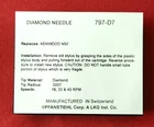 Brand New Pfanstiehl replacement stylus 797-D7 Tip: Diamond .7 mil conical Speeds: 16, 33 or 45rpm NOT for 78rpm Tracking Force: 1-3 grams Replaces needles: AIWA AN8745, AN38 COLUMBIA DSN-44, DSN44 DENON DSN-47, DSN47 KENWOOD N-50 N-51 PIEZO YM 121, YM121 SANSUI SN-44, SN44 SANYO ST-40D, ST40D Used in cartridges: BSR P-269 P269 P-275 P275 KENWOOD V-50 V50 V-50R V50R V-50R, V-51, N51 SANSUI SV-44, SV44 Used in models: KENWOOD SP-125C SP125C KD-1600 KD1600 KD-1600-MKII KD1600MKII KD-22R KD22R KD-33F KD33F KD-40R KD40R KD-40RB KD40RB KD-44R KD44R KD-50F KD50F KD-55F KD55F KD-7X KD7X KRX-7 KRX7 P-7 P7 V-30 V30 V-50 V50 V-55 V55 V-33 V33 V-65 V65 V-55LX V55LX V-77GX V77GX FAST & FREE Shipping! PLEASE NOTE: Make sure the needle that you are buying looks exactly like the one you are replacing, if the cartridge has been changed, the stylus may not fit. If you are unsure, please don't purchase