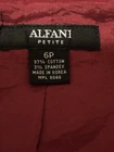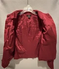 Elevate your office wardrobe with this stunning burgundy full zip top from ALFANI. Crafted from a blend of cotton and spandex, this mid-length jacket features long sleeves and a solid pattern that is perfect for any formal or business occasion. The jacket is equipped with a zip closure and button accents, and the twill fabric type adds a touch of sophistication to the overall design.This women's jacket comes in size 6P with a regular fit and is insulated with polyester for added comfort. The jacket also includes features such as shoulder pads, pockets, and lining made of polyester. Ideal for summer, fall, or spring, this basic jacket is a must-have for any working woman. The top is preowned in great condition. The jacket has a small chalk mark on the sleeve and may need dry cleaning to correct. See photo!