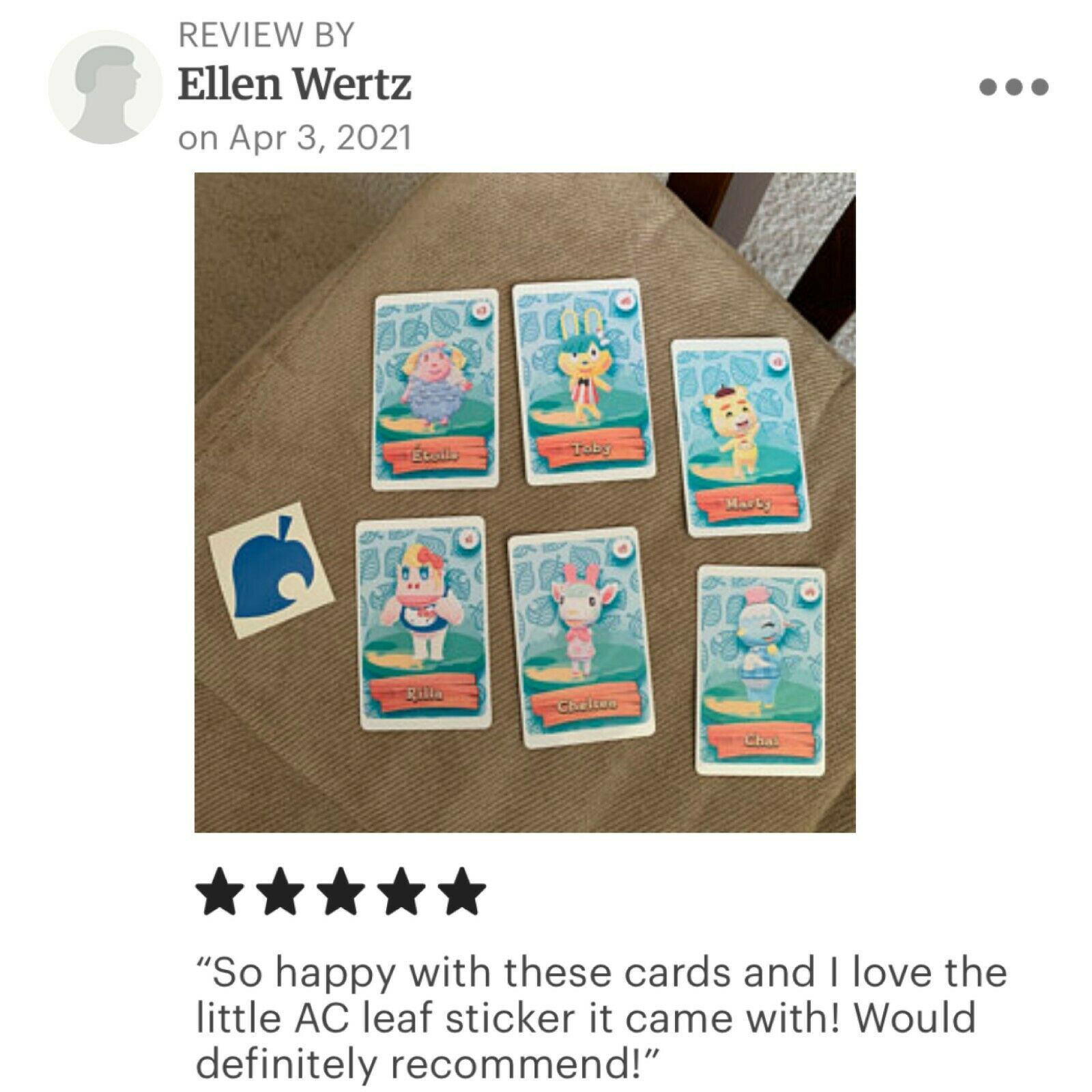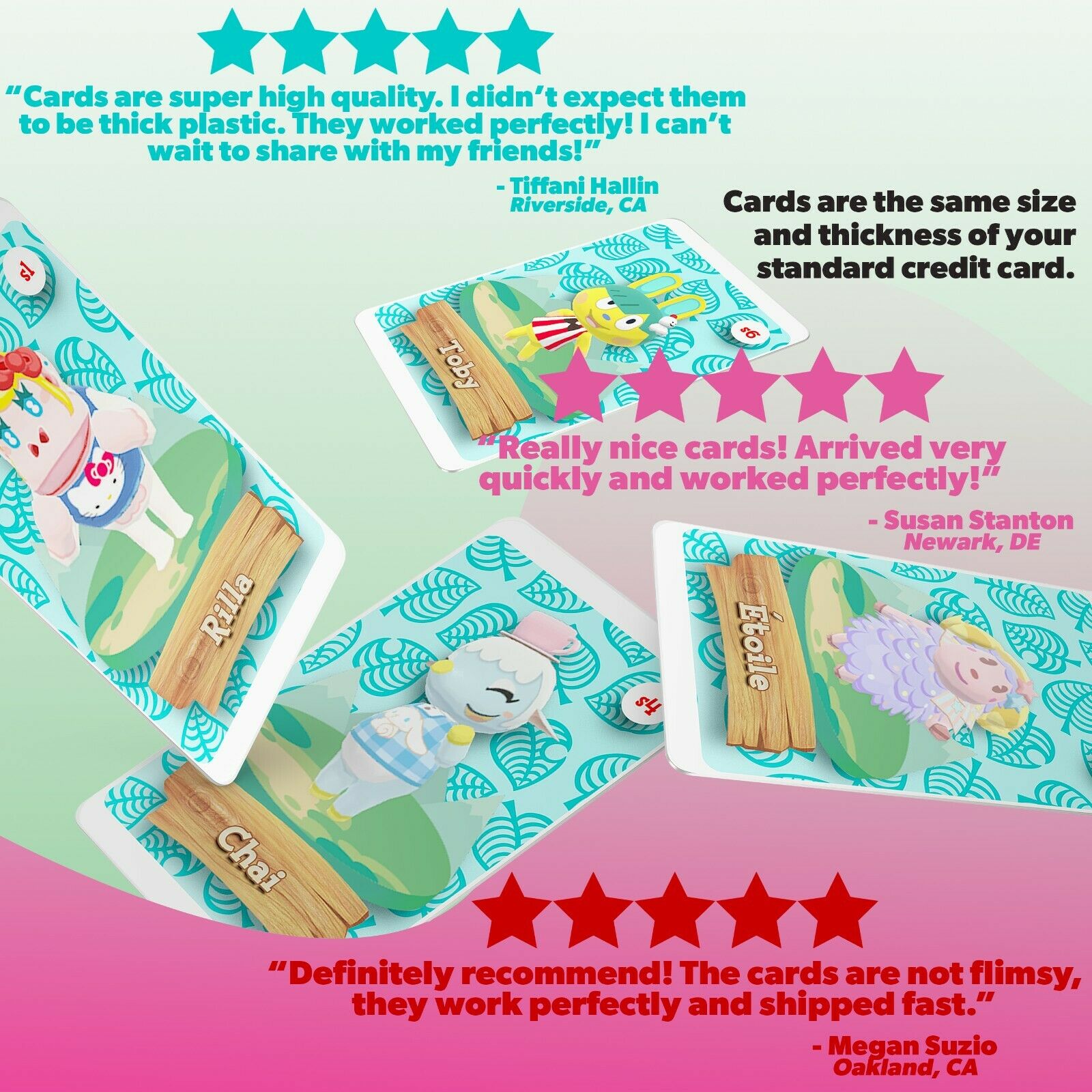 Page Title PICK YOUR VILLAGERS! Over 380 Villagers to Choose From! ➡ Please Read Description ⬅ Nearly every available VILLAGER in Animal Crossing:New Horizons and New Leaf can be YOURS ! ❤ Sanrio Series Villagers, Series 1-4, Welcome Amiibo Series, and Promo Villagers are all available ❤ You get to pick which ones you would like on your island! These are made to order! ONE FREE Villager for every FIVE Villagers ordered! (i.e. 5 + 1 Free, 10 + 2 Free, 15 + 3 Free, 20 + 4 Free, 25 + 5 Free) *Checking out with a purchase quantity of 5 cards means you will be receiving 6 cards in total* IMPORTANT: Message me after checkout with the names of your desired Villagers. Do not forget to include your FREE Villager's name (if applicable). If not, one will be randomly chosen for you. UNFORTUNATELY, THE FOLLOWING VILLAGERS DO NOT HAVE AN AMIIBO YET: Audie, Cyd, Dom, Judy, Megan, Raymond, Reneigh, and Sherb These Amiibo cards allow you to scan your favorite Villager onto your island and kick your unwanted villagers out (if your island is full). After three days of talking to the Amiibo villagers on the island, they will officially move into your island! ❤FREE Animal Crossing Leaf Decal Sticker with EVERY ORDER!❤ We use high quality PVC plastic cards with a Laser Printed High Resolution Graphic label of your Villagers image affixed to identify it. Please Note: These are custom handmade items, with high quality image resolution. They are third party items that scan into your gaming device exactly like the originals. Each card will bear graphics created by our shop, so they will be one of a kind! The intended purpose, which is to summon a villager, is 100% the same regardless of the image used . SHIPPING and HANDLING Card Qty Shipping Fee Tracking 1-3 FREE USPS ✖ 4-20 FREE USPS ✔ 20+ FREE USPS Priority ✔ 1-3 *Upgrade to First-Class or Priority Shipping ✔ REVIEWS TROUBLESHOOTING If you are unable to register the amiibo , try the following: Restart the console by holding down the POWER Button for three seconds, then select "Power Options" > "Restart." Reset the amiibo data. Try registering a different amiibo "FAILED TO READ AMIIBO" = This message usually requires a restart or an update may be needed. *Please reach out to our store if any cards do not scan. There is always the possibility of data loss due to exposure of extreme static electricity and magnetic fields during shipping.