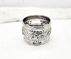 Antique Tiffany & Co. Daisy pattern wide, heavy, wavy edge sterling silver napkin ring. Measures 1 1/2" wide x 2" diameter across the open ends and weighs 44.6 grams. Excellent condition with no dings or dents and only modest, if any, wear. All raised pattern work remains crisp and well defined. One side of the ring shows a small, heavily scripted FCS(?) monogram. Stamped Tiffany & Co. sterling on inside edge. Please enlarge all pics for best details.