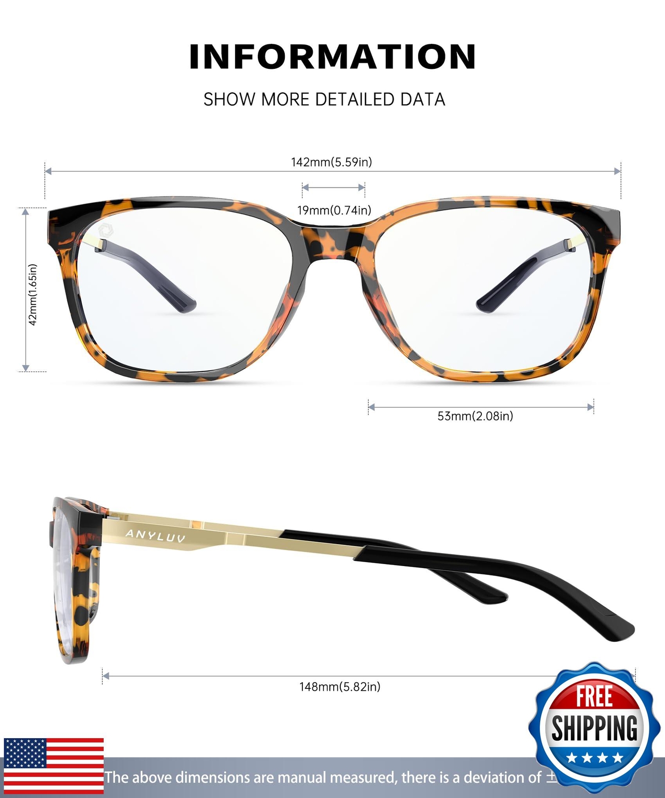 ANYLUV Blue Light Glasses for Men, Computer Gaming Glasses men, Stylish Anti Eyestrain Blue Light Blocking Glasses Men Features SCREEN PROTECTIVE GLASSES FOR WOMEN AND MEN: ANYLUV blue light glasses for women features blue block, It can effectively filtering out harmful high-energy blue light rays from screens while still allowing beneficial blue light to pass through for optimal eye comfort. HIGH DEFINITION VISION: ANYLUV men blue light glasses have low color distortion lens ensures that you experience minimal color alteration, providing a clear and vibrant visual experience without compromising on eye protection, perfect for both work and leisure. EYE PROTECTION: With the increasing use of digital devices, protecting your eyes from high-energy blue light is crucial. ANYLUV blue light blocking glasses offer a reliable solution to reduce the risk of discomfort and long-term sight conditions, ensuring your eyes stay healthy and refreshed. BOOST YOUR FOCUS AND ENERGY: Prolonged exposure to blue light can lead to fatigue and decreased productivity. Our blue light glasses for women are designed to reduce glare and eye strain, helping you maintain your focus and energy levels throughout the day. THOUGHTFUL GIFT PACKAGING & CUSTOMER SUPPORT: Each pair of our blue light glasses for women comes beautifully packaged in a stylish box, making it an excellent gift for loved ones.We are committed to quality and customer satisfaction, offering dedicated after-sales support for all our products. Shipping Free & Fast Shipping: We offer free shipping to most of the USA with a normal delivery time of 3-7 days. However, due to the current situation, additional delivery time (up to 3 weeks) may be required for some items. Alternative Carriers: We may use alternative carriers (e.g., USPS, FedEx, UPS) to ensure your package arrives safely and on time. Due to the use of multiple carriers, we are unable to provide a tracking number automatically. Handling Time: Orders are processed and shipped within 1-2 business days of receiving cleared payment. Shipping Restrictions: Shipping to Alaska, Hawaii, Puerto Rico, Guam, and other US territories may incur shipping charges or delivery restrictions. Please contact us before ordering, or your order can be refunded/cancelled. State Restrictions: Certain items may not be shipped to California due to state regulations. Contact for Tracking Updates: If you require tracking updates or have any concerns about the delivery of your order, please feel free to contact us, and we will be happy to assist you. Return Policy 30-Day Hassle-Free Returns: If you are not completely satisfied with your purchase, you can return the item for free within 30 days of receiving it for a full refund or exchange. Easy Return Process: Contact us, and we will provide you with a prepaid return shipping label and detailed instructions. No Restocking Fee: There are no restocking fees for returns. However, the buyer is responsible for return shipping costs if the return is not due to a seller's error. Refund Processing: Refunds will be processed within 1 business day of receiving the returned item in its original condition. Payment We accept all major credit cards, PayPal, and Apple Pay for your convenience. Your payment information is secure and encrypted to ensure a safe and seamless transaction. Please complete your payment within 3 days of purchase to avoid any delays in shipping. Feedback Your feedback is extremely important to us. We strive to provide the best products and customer service possible. If you are satisfied with your purchase, please take a moment to leave us a positive review. If you have any concerns or issues with your order, please contact us before leaving negative feedback. We are committed to resolving any problems and ensuring your satisfaction. Contact Us If you have any questions or concerns, please feel free to reach out to our customer support team. You can contact us through the eBay messaging system. We are available Monday to Friday, 9:00 am to 5:00 pm EST, and we will do our best to respond to your inquiry within 24 hours. Thank you for supporting our small family business!
