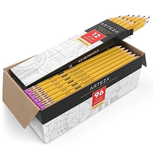 ARTEZA School Pencils HB #2, Pack of 96, Wood-Cased Graphite Pencils in Bulk, Pre-Sharpened, with Erasers Box of 96 Count #2 Pencils With Latex-free Erasers: Our Arteza Pencils are a go-to both for an office and a school maintaining their classroom supplies. They're certified nontoxic and safe for use by all ages. Satin Matte Coating for a Comfortable Grip: Each pencil is finished in a special coating, giving them a comfortable grip. These number 2 pencils are hexagonal in shape to fit nicely in your hand when writing, scribbling, or doodling. This set of pre-sharpened pencils features break-resistant cores to ensure easy and even sharpening. The hard lead will not smear nor smudge, and works both for scantron tests and rough drafts. Designed and Created by Artists: Here at Arteza, we are passionate about creating products that inspire. For us, art is an expression of the human experience. That’s why we work to make our art supplies accessible to all people. Office Supplies of All Kinds: Arteza was built on providing quality stationery, home office, and classroom supplies for everyone. Find tons of office organization tools and school accessories to help you clear out your desk storage space and prepare for a productive day. Arteza wood-cased #2 pencils come in smaller boxes of 12within a larger box for supply management ease. The HB #2 lead writes smoothly,giving dark, long-lasting lines which are perfect for test taking, scantrons,and first drafts. The graphite is certified non-toxic, and is speciallyformulated to resist breaking, keeping tips sharp and ensuring an intact corefor the life of the pencil. The latex free eraser lifts even the heaviest ofmarks without smudging and remove even the darkest of mistakes completely. Itis designed to last through multiple corrections. This makes them perfect forcrosswords, word searches, and other puzzles. Each writing instrument is casedin wood from responsibly managed forests, and the graphite is formulated fromrenewable resources with the environment in mind. They are finished in astylish soft ocher-yellow, satin-smooth finish to give a secure grip that iscomfortable to write with for hours. These are the perfect pencils for in theclassroom, office, or home. If you are an artist, writer, or crossword junkie,these pencils will perform for you.