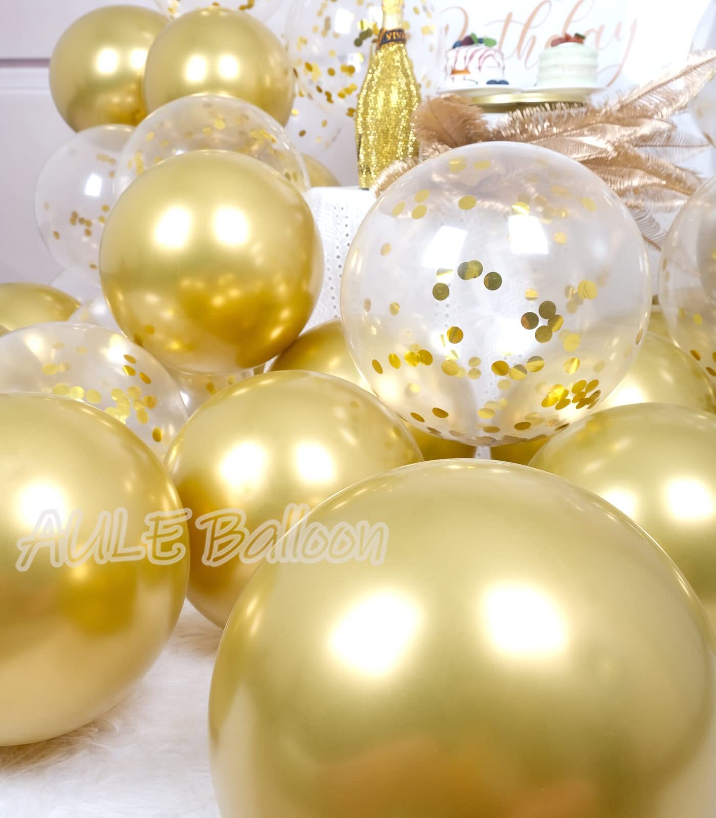 AULE Party Balloons Pack of 42 - Metallic Gold Balloons & Gold Confetti Balloons and 64ft Ribbons - 12 Inch Balloons Decorations Set What's in the pack: Gold metallic balloon, 12 inch, Pack of 20 Gold confetti balloon, 12 inch, Pack of 20 Gold Ribbons, 32ft, Pack of 2 How to achieve the perfect confetti balloon: We recommend using high-quality helium to fill your confetti balloons. At-home tanks, low grade helium or helium mixed with nitrogen is not strong enough to keep balloons afloat. Don't fill the balloon with too much helium to prevent them from popping. By adding a very small amount of water or hairspray into the balloon when blowing up can help the confetti stick to the sides even better, be careful to not overdo it. A way to create excellent static is to rub the balloon either on a piece of fleece, your hair, or a carpet. Remember to inflate the balloon to its maximum capacity, if not the confetti is too heavy for the balloon to float properly. Why choose us: High-Quality Safe Party Decorations! AULE Balloon has been trusted by thousands of customers served! Making every beautiful occasion a beautiful day is our mission! Customer experience is our utmost priority! Money back guarantee! Balloons size: 12 inch; Metallic balloons: 20 pcs; Confetti balloons: 20 pcs; Ribbons(32ft): 2 pcs The metallic color of latex balloons are new fashion trends, you will most certainly hear “WOW!” when party goers see these balloons, because the metallic color of the latex balloon is so beautiful Our customers love these balloons for wedding, happy birthday party, engagement party, baby shower, bridal shower, graduation party, prom decorations, and more AULE balloons are made with durable helium strength latex and rigorously tested to ensure you have the best experience for your party; please don't use these balloons as toys for children under the age of 8 without an adult If you are not satisfied, please contact us through the Amazon system email, we look forward to customer suggestions so that we can better improve the product Shipping from the USA All of our products are shipped from the USA, ensuring quick delivery to your destination. Payment We offer the following payment methods: PayPal, credit card, bank transfer, and eBay's secure payment system. Free Shipping & Free Returns Shipping within the USA is FREE. Additionally, any return is absolutely free for you. Risk-Free Purchase You have the option to return an item within 30 days without any justification. We cover the return shipping costs! Fast Shipping We ship immediately upon receipt of payment. Generally, the package is delivered within 2-3 days in the USA. If it takes longer, we will contact you. Quality and Costs Made in Europe, USA, China No customs fees or additional charges Total satisfaction guarantee Invoice with declared VAT available upon request in .pdf format Feedback Your feedback is very important to us. After you pay for your purchase, you will automatically receive positive feedback from us.