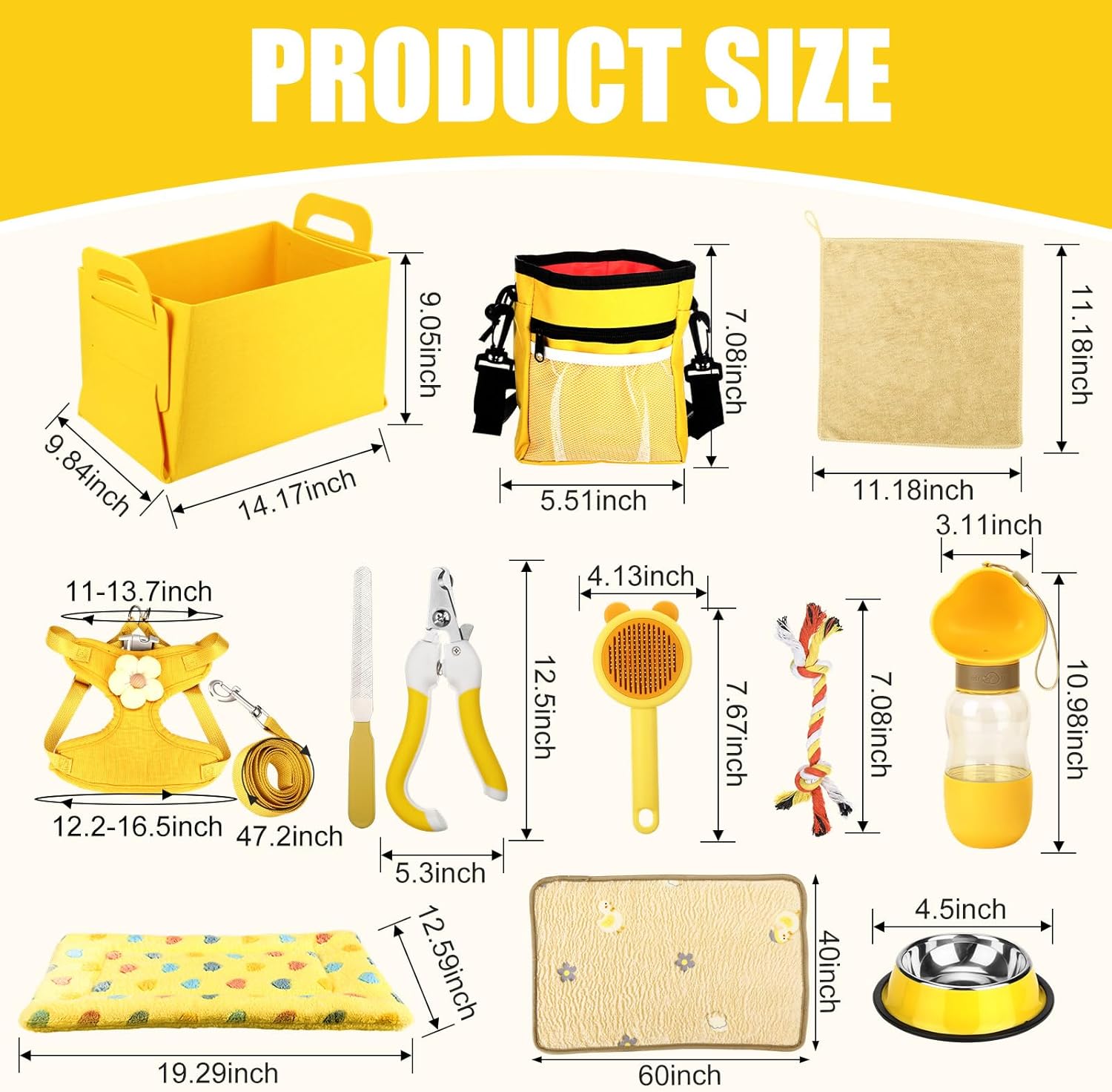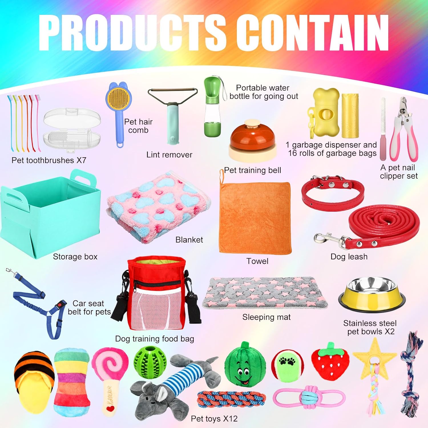 Abbylike 50 Pcs Puppy Supplies Starter Kit for Small Dogs Puppy Essentials Includes Leash, Bowls, Teeth Brushes, Water Bottle, and More Accessories for Dogs Christmas Welcome Gift (Colorful) Product Details Item Weight: 5.08 pounds Manufacturer: Abbylike Item model number: SMO-Abbylike-3833 Item Package Dimensions L x W x H: 13.78 x 11.02 x 6.89 inches Item Dimensions LxWxH: 13.78 x 11.02 x 6.89 inches Item Weight: 5.1 Pounds Brand Name: Abbylike Target Audience Keyword: dogs Model Name: SMO3833 Color: colorful Material: Felt, Rubber, Plastic, Leather, TPR, Stainless Steel, Cotton Age Range Description: Puppies and young small dogs Number of Items: 50 Style: Colorful Breed Recommendation: Small Breeds Included Components: 12 x Dog chew toys (different materials) 6 x Double sided pet toothbrushes 1 x Storage basket 1 x Training bag 1 x Order bell 1 x Finger brush 1 x Pet hair remover 1 x Pet pad 1 x Blanket 1 x Towel 1 x Car seat belts for dogs 1 x Dog Leash 1 x Bone shaped dog poop bag dispenser 16 Rolls dog poop bags 1 Set dog nail clipper 2 x Dog bowls 1 x Water dispenser 1 x Pet comb Product Dimensions : 13.78 x 11.02 x 6.89 inches; 5.08 Pounds Item model number : SMO-Abbylike-3833 Manufacturer : Abbylike Cute and Essential Puppy Starter Kit: Our puppy essentials starter kit is beautifully designed to fulfil both functional needs and quaint aesthetics; The comprehensive package includes 1 felt storage basket, 12 chew toys, 1 training bag, 1 dog leash, 1 TPR finger brush with case, 2 stainless steel bowls, 1 soft cotton towel, 1 blanket, 1 pet pad and more, ideal for female dogs Properly Sized Accessories: our dog essentials for small dogs are mindfully sized to ensure your pup's comfort; The felt storage basket measures 14.17 x 9.84 x 9.06 inches, providing ample space for neatly organizing your puppy's tools and toys; For your dog's sanitary needs, we provide a 19.29 x 12.6 inches/ 49 x 32 cm pet pad; To keep your puppy warm and comfy, we include a 23.62 x 15.75 inches blanket and an 11.81 x 11.81 inches towel, making your puppy feel right at home Grooming Essentials and Interactive Toys: the dog essentials for puppies kit comes packed with 12 fun and engaging chew toys of varying materials, 6 double sided pet toothbrushes, a finger brush and a pet hair remover for grooming needs, and a bone shaped dog poop bag dispenser with 16 rolls of poop bags; This kit ensures your puppy's hygiene and dental health are taken care of while simultaneously providing an array of chew toys that will stimulate and entertain your pup Well Prepared Travel Pack: these puppy accessories for female dogs are more than just a home starter kit; It also doubles as your travel package with a convenient car seat belt for dogs, portable water dispenser, and lightweight yet durable training bag; With our pack, you need not fret about forgetting any of your puppy's essentials, making your travel experience more pleasant and worry free Ideal for Training and Adaptability: assisting your new puppy to get accustomed to its surroundings will be easier with our puppy starter kit for small dogs; The kit includes items like order bell for training purposes and an assortment of chew toys to help reduce anxiety levels; These features make the transition more manageable while fostering an interactive bond between you and your pup; Also included is a medium size dog leash, ideal for training sessions across various sports Features: This puppy essentials starter kit is carefully put together to make the transition of bringing a new pet home seamless and straightforward. The kit is inherently designed for maximum convenience, saving the time and effort spent on individual product hunting. With female dog accessories like a pet comb, dog toothbrushes, a pet hair remover, and a durable nail clipper, your grooming sessions are sorted. Each grooming tool is designed with your puppy's comfort in mind. This puppy grooming kit for small dogs ensures effective cleaning and grooming while taking care of your adorable pet's sensitive needs. Specifications: Main material: felt, rubber, plastic, leather, TPR, stainless steel, cotton Main color: colorful Size: about Storage basket: 14.17 x 9.84 x 9.06 inches/ 36 x 25 x 23 cm Pet pad: 19.29 x 12.6 inches/ 49 x 32 cm Blanket: 23.62 x 15.75 inches/ 60 x 40 cm Towel: 11.81 x 11.81 inches/ 30 x 30 cm Dog Leash: M Package includes: 12 x Dog chew toys (different materials) 6 x Double sided pet toothbrushes 1 x Storage basket 1 x Training bag 1 x Order bell 1 x Finger brush 1 x Pet hair remover 1 x Pet pad 1 x Blanket 1 x Towel 1 x Car seat belts for dogs 1 x Dog Leash 1 x Bone shaped dog poop bag dispenser 16 Rolls dog poop bags 1 Set dog nail clipper 2 x Dog bowls 1 x Water dispenser 1 x Pet comb Notes: Manual measurement, please allow slight errors on size. The color may exist a slight difference due to different screen displays. Small items are included, please keep them away from pets in case of choking risk. Before purchase, confirm whether the product size is suitable for your pet, and observe the pet's reaction when using. Please remove the product in time if there is any discomfort