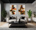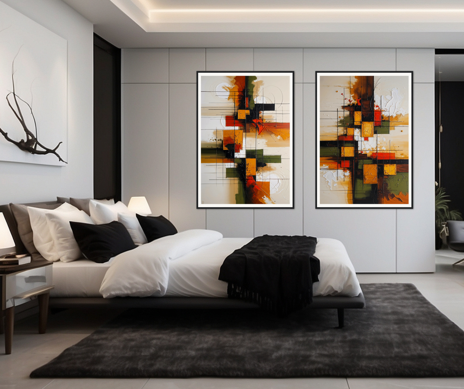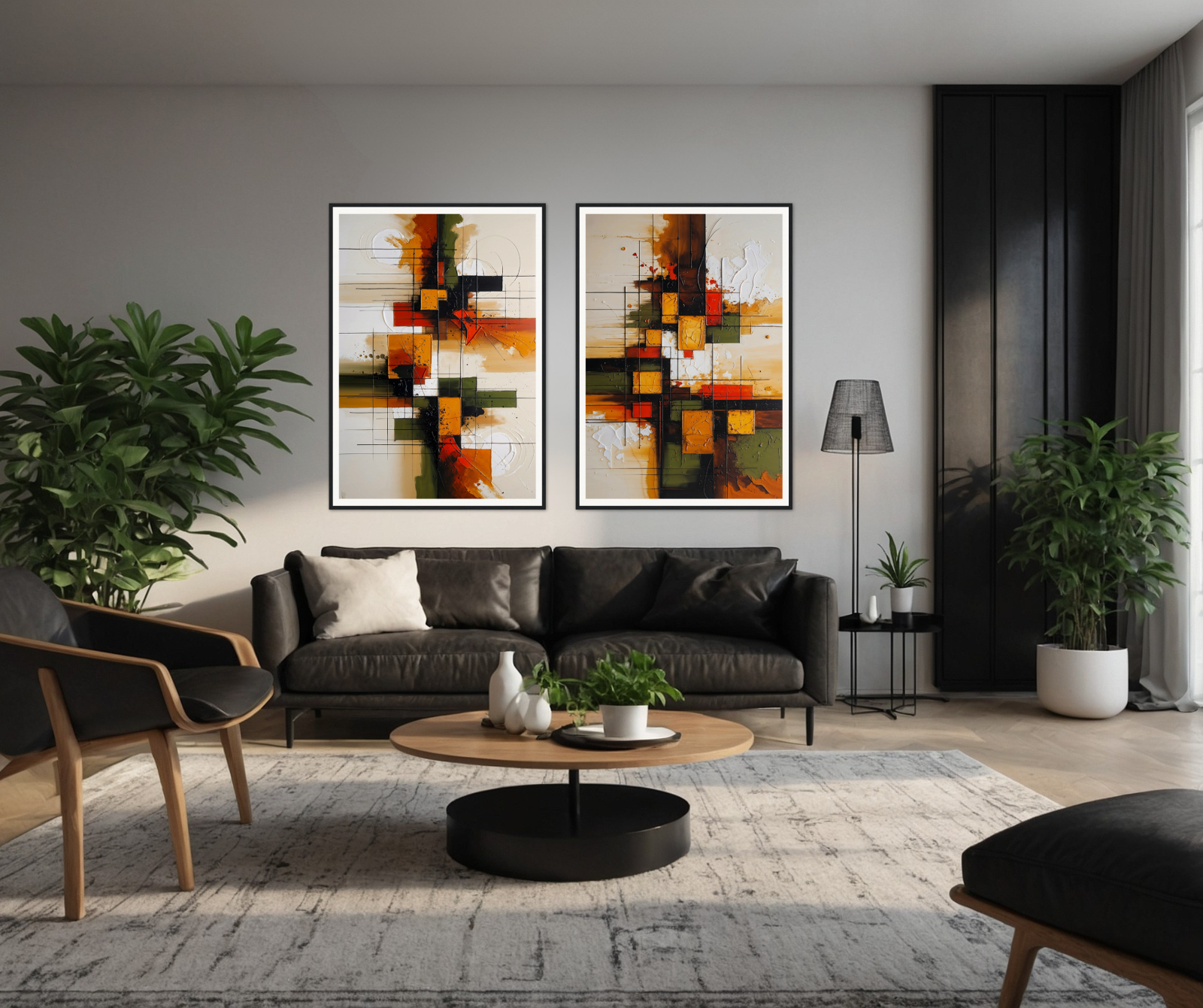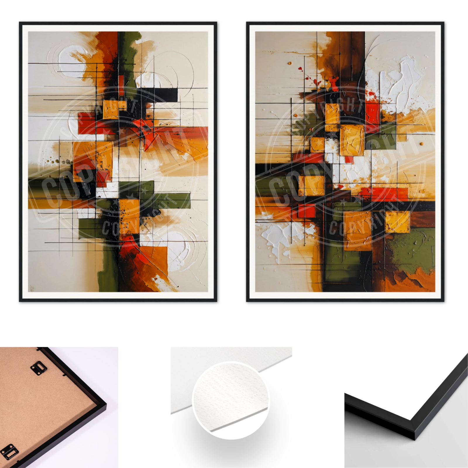 "Moody Geometrics: Abstract Harmony" – 2-Piece Acrylic Abstract Painting Licensed Reproduction Prints Elevate your space with "Moody Geometrics: Abstract Harmony" , a striking 2-piece abstract painting reproduction print set by Hypnotik Creations. This licensed reproduction features a captivating blend of geometric design and a moody color palette, creating a modern yet thought-provoking composition that adds depth, structure, and visual intrigue to any room. Each piece in this harmoniously balanced duo showcases bold shapes, layered forms, and textured brushwork , evoking a sense of rhythm and movement . The carefully curated color palette blends deep, moody hues with contrasting highlights , making this set a statement piece for contemporary, industrial, or minimalist interiors . Printed using state-of-the-art HDR technology on museum-quality, heavyweight matte paper , every brushstroke and tonal variation is preserved with stunning clarity . The rich, true-to-life colors are achieved using Misaki UV-resistant inks , ensuring long-lasting vibrancy and fade resistance over time. This exclusive 2-piece set is available as high-resolution licensed reproduction prints , allowing you to experience the essence of original acrylic artwork without compromising on quality. Each print arrives unframed , providing the flexibility to choose a custom frame or display method that best suits your space. Designed to be versatile and impactful , "Moody Geometrics: Abstract Harmony" is perfect for living rooms, offices, bedrooms, or gallery walls , adding a sense of depth, mystery, and modern sophistication . Key Features: Ready-to-hang: Includes hanging kit, ready to hang directly on the wall. Frame Material: Durable pine wood. Frame Color: Black Frame Measurements: 20-25mm (0.79"-0.98") thick, 10-14mm (0.4"-0.6") wide. Paper Weight: 250 gsm (110 lb), Thickness: 0.29 mm (11.4 mils). Paper Finish: Matte, uncoated, natural white (off-white). Protection: Shatterproof plexiglass protects the print. Sustainable Paper: FSC-certified materials or equivalent. Available Sizes: 28x40 Packaging: The prints are placed within frames upon arrival. The frames come pre-packed with corners and wrap and then packed in a box with strong edges to protect the frames. I-beams are used in addition, to give the package additional sturdiness and for multi-item orders (max 3 frames in one package).