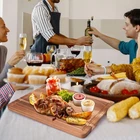 Acacia Wood Cutting Boards for Kitchen, Wooden Chopping Board with Side Handle and Juice Groove, 15" X 11" Carving Board, Butcher Block, Cheese Charcuterie Boards for Meat, Fruit, Steak Best Acacia Wood: This chopping board is made of food-grade acacia wood which is a very hardy and heavy wood. It cleans so easy for daily use, and well polished with a smooth surface, easy to clean by hand. Double - Sided Usability: The cutting boards can be reversible for double-sided use with a juice slot on the front for cutting of meat and fish to catch excess liquid during food preparation. The flip side is flat with no groove perfect for slicing of bread, cheese, vegetables and fruit. Kitchen Essential: was designed to be the most functional cutting board you've ever had. This chopping board could be used as cutting, chopping, carving board, cheese board, heavy duty butcher block, serving tray for guests, or a Charcuterie board and decorative piece. There are perfectly routed finger grooves at each end for easy lifting and carrying. Measurements: The board of 15" x 11" is a good size can meet your are great for most kitchen uses and allows it to store easily in a cabinet or against a counter back splash. Knife-Friendly Surface: This natural Acaciacutting board is hard enough to resist deep gouging yet supple enough not to rapidly dull your knives, a perfect combination. .