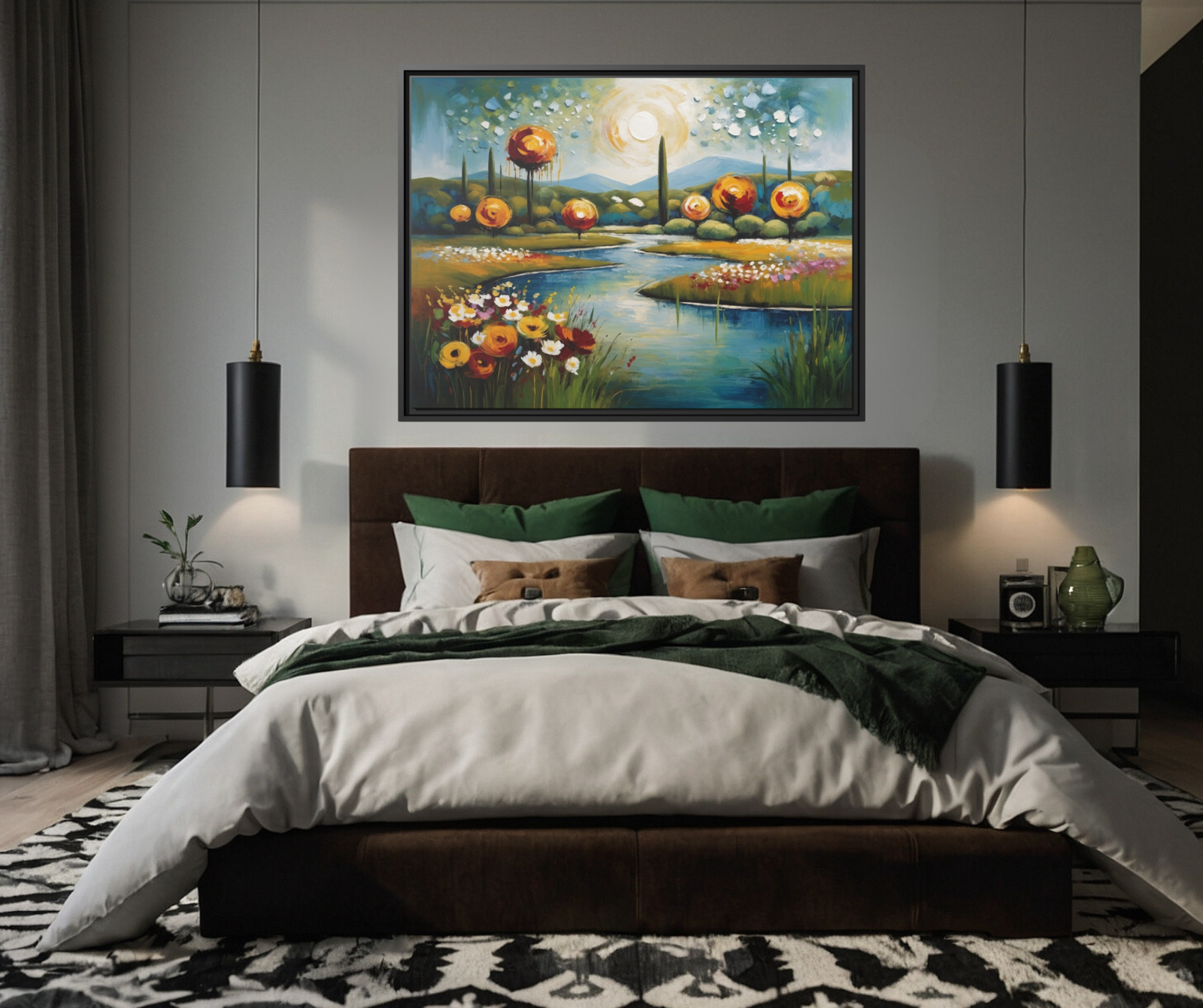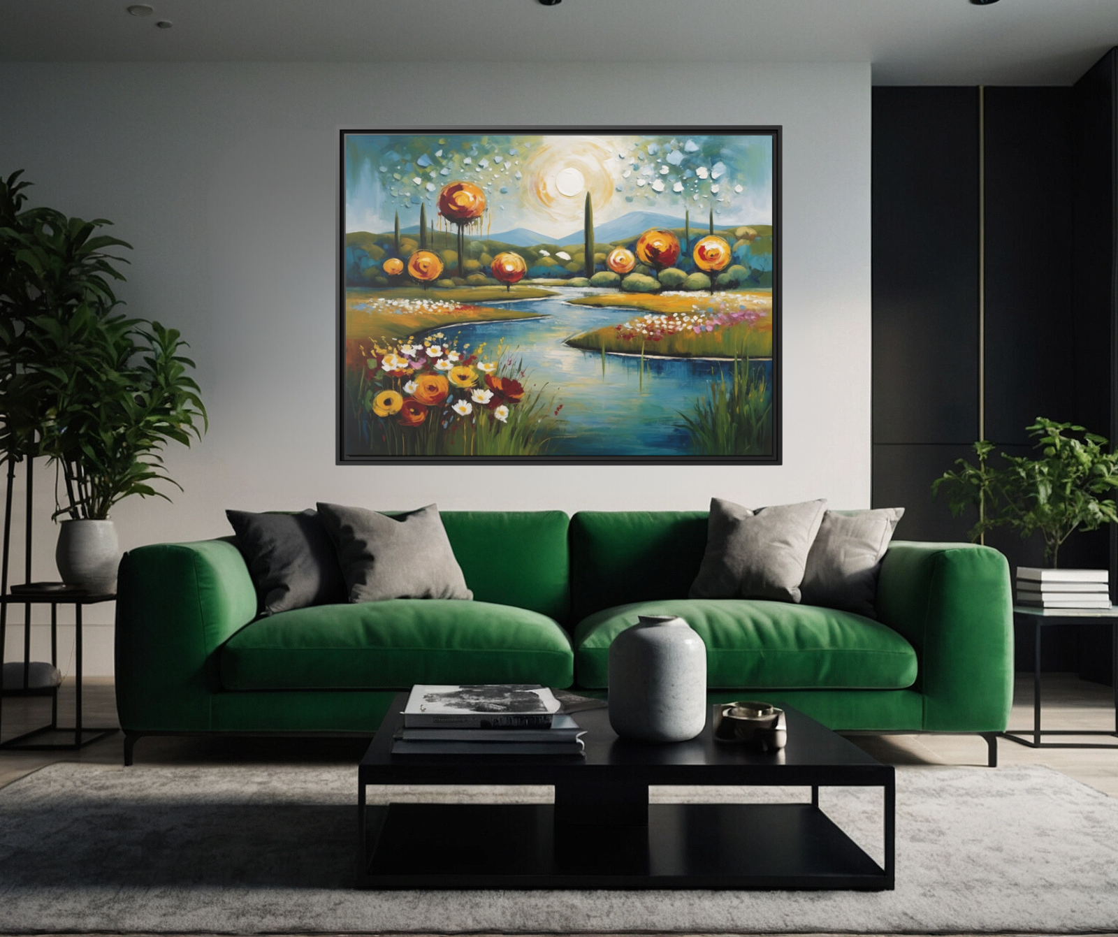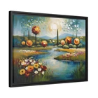 Introducing " Ethereal Horizons ," an exquisite acrylic abstract painting reproduction that captures the serene beauty of a summer landscape in an impressionist contemporary style. This artwork depicts a winding, flower-lined river leading to distant mountains and trees under a bright, sunny sky, using nature's vibrant color palette. Printed on high-quality framed canvas, "Ethereal Horizons" combines the rich texture of acrylics with the durability of modern printing techniques. The elegant frame enhances its captivating presence, making it a perfect addition to any decor. Bring the enchanting charm of a sunny summer day into your home or office with this stunning canvas print. Crafted with state-of-the-art technology, this gallery-wrapped canvas print elevates traditional art, embodying exceptional quality and craftsmanship. Each reproduction is elegantly framed in sleek black pinewood, designed to effortlessly enhance any interior decor. Printed on premium cotton-polyester canvas with a specialized coating, these prints maintain their vibrant colors for decades. Utilizing UL-certified Greengard Gold inks, they ensure superior image fidelity while adhering to sustainable practices certified by the Forest Stewardship Council. Available exclusively in three sizes—24x18, 32x24, and 40x30—each print includes sawtooth hanging hardware and wall bumpers. Stretched on a custom radial pine profile crafted from FSC-certified renewable forests, these prints ensure both environmental responsibility and lasting quality. Offered only here, these art prints provide a perfect blend of tradition and modern craftsmanship. Prices include production costs, shipping and handling, and artist license fees. 4o * Shipping to Alaska, Hawaii, and unincorporated territories of the United States can take additional 7 ? 12 business days, weather permitting.