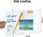 Acrylic Sign Holder 11 X 17 Wall Mount Sign Holder Clear Plastic Picture Frames with Double Sided Tape Adhesive and Screws for Office, Home, Store, Restaurant - Landscape, 12 Pack Premium Acrylic Material: Our sign holder is made of top-quality acrylic. Lightweight but shatter-resistant. Perfect for displaying and protecting content from scratches, stains, and tears Easy to Assemble: 1. Installing the wall mounted sign holder by using screws & anchors(Included in this Package). 2. Hanging it by using a string(String not included). 3. Sticking it by using double sided adhesive strips(Included in this Package). Easy to Switch: Paper can be taken in and out easily daily without removing frame from the wall. The wall mounted sign holder is a simple one piece of acrylic heat folded at the bottom while it is open around the top and sides. Multi Pack: It contains 12 pieces of 17 × 11 inches sign holders, 24 strips of double sided adhesive tape, 24 screws and wall anchors. Perfect for displaying menu, announcement and photo. It can be used in restaurant, mall, outlet, exhibition, church and hospital. After-Sale Service: for damaged or defected items. Please contact with us at any times if you have questions about the item. We will help you solve the issues about the product.