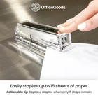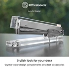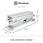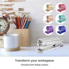 The Acrylic Stapler is elegantly designed with a high transparent luster and a crystal-like appearance with smooth, shiny edges that looks great on anyone's desk. Bring style to your home or office with our gold- or silver-accented acrylic stapler; this handmade product enhances any modern decor. This cool desk product makes a great gift; create a set with a matching tape dispenser and pencil holder (sold separately). Using standard staples (not included), you can easily attach 12-15 sheets, while non-skid feet help reduce movement and provide stability. This one-hand stapler will shine on your desktop or is small enough to fit in a drawer conveniently. Made with heavy acrylic for daily use and measures 5.25" L x 1.25 W x 2.5" H; clean as needed with a damp cloth. Unique stapler design - Elevate your workspace with a stapler for desk that combines form and function. This manual office stapler unites acrylic and metal for a modern look and aesthetic appeal. Reliable Stapling Performance - Effortlessly staple up to 15 sheets with this sleek stapler for your desk. Measuring 5.30 L x 1.30 W x 2.50 H, it uses standard 1/4" staples for everyday tasks. Multiple use - This long stapler weighs 10.8 ounces; it's a versatile tool that can be used for stapling and holding down paper. For optimal stapling, replace staples when the strip reaches five. A fancy stapler for colorful ideas - choose from these bright colors to complement your style. Available in rose gold, green, purple, pink, blue, silver, golden. Match your - offers acrylic staplers and many more essential office products, creating a stylish and cohesive look, all crafted with the best quality and aesthetic design in mind.