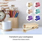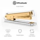 The Acrylic Stapler is elegantly designed with a high transparent luster and a crystal-like appearance with smooth, shiny edges that looks great on anyone's desk. Bring style to your home or office with our gold- or silver-accented acrylic stapler; this handmade product enhances any décor. This cool desk product makes a great gift; create a set with a matching tape dispenser and pencil holder (sold separately). Using standard staples (not included), you can easily attach 12-15 sheets, while non-skid feet help reduce movement and provide stability. This one-hand stapler will shine on your desktop or is small enough to fit in a drawer conveniently. Made with heavy acrylic for daily use and measures 5.25" L x 1.25 W x 2.5" H; clean as needed with a damp cloth. Unique stapler design - Elevate your workspace with a stapler for desk that combines form and function. This manual office stapler unites acrylic and metal for a modern look and aesthetic appeal. Reliable Stapling Performance - Effortlessly staple up to 15 sheets with this sleek stapler for your desk. Measuring 5.30 L x 1.30 W x 2.50 H, it uses standard 1/4" staples for everyday tasks. Multiple use - This long stapler weighs 10.8 ounces; it's a versatile tool that can be used for stapling and holding down paper. For optimal stapling, replace staples when the strip reaches five. A fancy stapler for colorful ideas - choose from these bright colors to complement your style. Available in rose gold, green, purple, pink, blue, silver, golden. Match your - offers acrylic staplers and many more essential office products, creating a stylish and cohesive look, all crafted with the best quality and aesthetic design in mind.