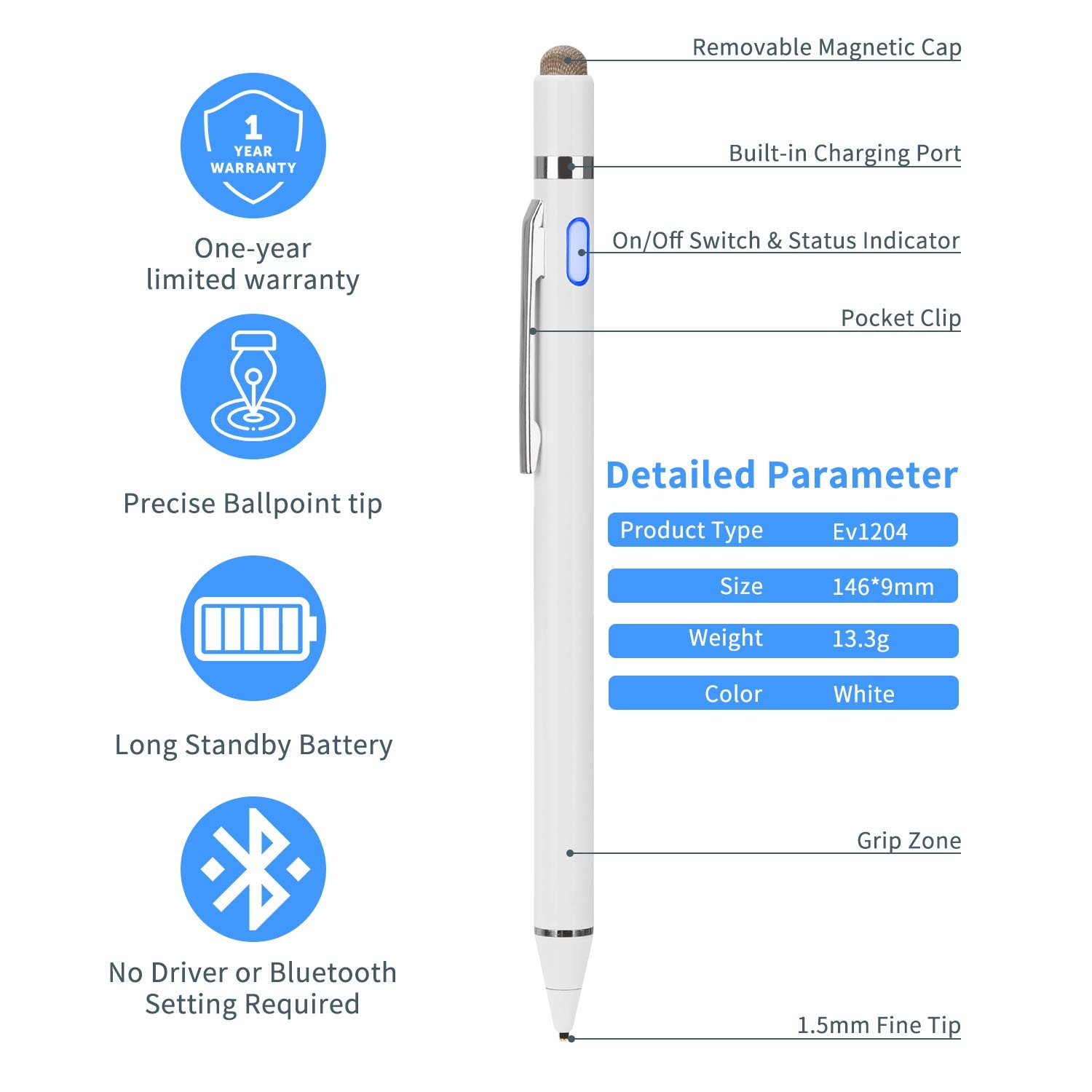 1.5mm Fine Point iPad Stylus Pen lets you draw,write and navigate with pinpoint accuracy and offers comfortable pen-like control for Pencil Apple Anodized aluminum body iPad Stylus Pen Provide durability and offers a stylish appearance Pocket Clip keep the drawing stylus pen for iPad Pro within reach for easy portability Soft Tip Pen for iPad Pro allows you to interact with your device's touch screen without leaving scratches or smudges Magetic Cap offers easy operation while provides protection against dust and damage, available as normal tip while active stylus is out of power CONTENTS -Active Stylus*1 -Removable Magnetic Cap*1 -Manual*1 -USB Charging cable*1. Recommended Applications: iOS: --Writing: GoodNotes, UPAD3, Noteshelf, Notes Plus, Notability, etc. --Drawing: ArtRage, Procreate, Sketches, Paper, SketchBook, ArtStudio, Zen Brush, etc. Android: --Writing: Meta Moji Note, Notepad+, Bamboo Paper, etc --Drawing: Autodesk SketchBook, ArtFlow, Painter, Design, Zen Brush, etc. Easy Steps to Start: 1. Press on the power on button. Open recommended drawing/writing applications in your device andchange the input method to handwriting. 3. There you go. Enjoy design with the stylus as you want. Now you can start using it. 4. Tip: there isn't bluetooth connection or cable connection with your device. If you are using iPad or Pro series with newest iOS system, follow below additional steps: 1. Enter Setting. 2. Select Application which you are gonna to use for drawing/writing, here we take Notes as example 3. You will see there is an option for Apple Pencil, turn off this function Only Draw with Apple Pencil 4. Now you can using our stylus as expected. If you have any question or concern, just let us know, we will help on troubleshooting. 【About Active Stylus】Fine, Light, Brief stylish design with 146mm length, 13.3g weight, 1.5mm tip for smoothly writing and drawing. More sensitive with long time wearing at best performance.Best Stylus for artist,journalist,teacher and students etc.【No Bluetooth Required】There is no bluetooth connection required for this stylus.If you are not aware of this, you might get confusion with other products. 【Upgraded Compatibility】It is compatible with most touchscreen devices, works as Apple pen,iPhone stylus for iPads,iPad Pros, Samsung pen for tablets and cellphones.With a more economic price,you get amost similar functions for Apple Pencil and Android Series Tablets.【IMPORTANT】With our new upgraded technology,this stylus works for iPad series 2018 and 2019 version now.This stylus for iPad 6th gen, 7th gen, iPad Pro ,Mini,Air series has been upgraded with new chip. 【Great Feature】Built-in battery provides 8 hours active use while it's fully charged with Micro USB in 60 minutes.Smart Saver,auto shutdown after 30 mintues for safety.Charging input is 5V/0.2A.【IMPORTANT】Don't Use Fast Charger as internal chip would be damaged due to high currency 【Precise Point Control】With buffer unit at Tip design gives you more accuracy and control against tablets and cellphones screen. No resistance when drawing and writing as real pen.【TIPS】Hold the stylus with a slight inclination angle to the screen will have better writing experience. Using screen protector will not affect the performance, if your device has one protector, you can use it without any worries. 【After Sales Service】Contact us if there is any question or concern on the product or service.It is our intention to offer great customer service for you.We will make everything right for you.