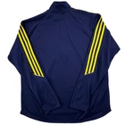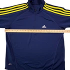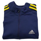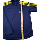 Adidas Climalite 1/4 Zip Pullover Mens Large Navy Blue Yellow 3-Stripes Training Pre-owned - Excellent Pre-owned pullover with light overall wear from prior use and laundering. Fabric is clean and intact with no stains, holes, or snags visible, and the zipper, seams, cuffs, hem, and adidas and Climalite logos are secure and functional. Minor loose threads near the shoulder stripe areas are present as shown in the photos. Brand: adidas. Style: Mens long sleeve Climalite 1/4 zip athletic pullover with mock neck and raglan sleeves. Size: Mens Large. Color: Navy blue base with bright yellow three-stripe detailing along the shoulders and sleeves and white logo accents. Labels/Origin: Embroidered adidas performance logo at the left chest and small printed Climalite logo at the lower left front hem; interior size and care tags are not shown in the available photos. Details: Lightweight textured performance knit fabric, quarter-length front zipper with stand mock collar, raglan sleeve construction for easy movement, contrast three-stripe trim from neck to cuffs, and a slightly curved hem suitable for training, running, soccer warm-ups, or casual layering. Material: Athletic performance knit fabric typical of polyester or polyester-blend tops; exact fiber content is not confirmed from the photos. Special notes: Pre-owned adidas Climalite training pullover; review all photos for close-up views of fabric texture, stripe detail, logos, and overall condition. 0088
