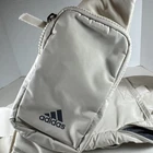 The Adidas Essentials 2 Sling Crossbody Bag in Alumina Beige Grey is a small rectangular bag with a zip closure and a beige crossbody strap. It is designed for travel and casual occasions, featuring a solid exterior color with a matte finish. The bag includes a strap accent, zipper accents, and comes with a pouch and key chain accessories. Made from polyester with stainless steel hardware, this unisex bag from the Adidas Essentials product line is perfect for outdoor activities, school, or the beach.