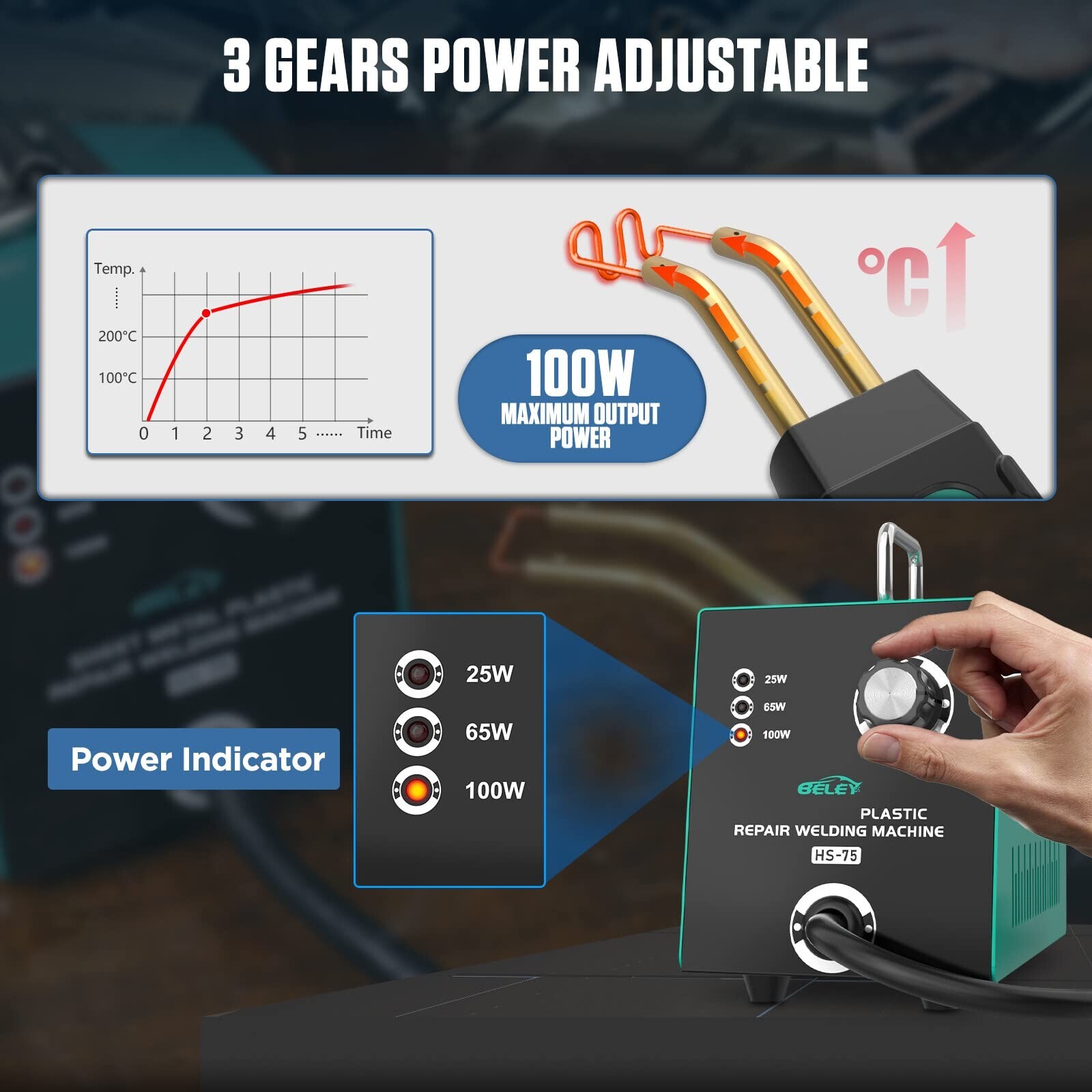 Plastic Welder Kit Hot Stapler - BELEY Adjustable 25W 65W 100W Plastic Repair Welding Machine, 110V Car Bumper Plastic Fixing Tool with 600pcs Staples,Father's Day Gifts Product Details Color: Imperial Green Brand: BELEY MPN: MMT5 UPC: Does not apply EAN: Does not apply Manufacturer: BELEY Part Number: MMT5 Item Weight: 7.83 pounds Package Dimensions: 11.38 x 9.21 x 5.47 inches Country of Origin: China Item model number: MMT5 Color: Imperial Green Material: metals Power Source: ac_dc Wattage: 100 watts Item Package Quantity: 1 Batteries Included?: No Batteries Required?: No Date First Available: September 14, 2022 3 POWER MODES: BELEY 110V Plastic Welder Kit has 3 power modes (25W/65W/100W) to choose from. You can choose the right power according to different plastic thickness. Children's toys are made of weak plastic material, choose 25W mode, which can protect the plastic from over melting and avoid secondary damage while repairing. For outdoor products and patio products with moderate plastic thickness, you can use 65W mode, which can repair the tear between welded plastic molecules faster. For car bumpers, large bins and other ultra-thick plastic products, it is recommended that you use the 100W mode to make the repaired plastic more solid and durable.Father's Day Gifts. HUMANISATION UPDATE: BELEY Hot Stapler Kit is upgraded to a rubber grip welder, which is lighter in weight and comfortable to hold, so you won't feel fatigue after holding it for a long time. The main body of our hot stapler is separate from the welding torch, avoiding the machine from heating up for a long time and causing burns to the operator. At the same time with a perforated plate host heat dissipation effect than the hand-held plastic welding machine, solving the problem of hand-held can not dissipate heat. It greatly improves the operator's experience and safety.The Best Father's Day Gifts for Auto Mechanics. 3 ANGLE WELDING JOINTS: BELEY Plastic Welder Kit can connect nails from 3 directions (0, 90, 180), choose the most suitable angle to place nails for different welding scenarios. And with built-in LED lights, you can get the job done in dark and tight environments. The item includes four types of nails, a smoothing triangle head (in the third 100W mode, the smoothing triangle head can quickly smooth plastic surfaces) and pliers to meet your different working needs.Arrives before Father's Day. WIDE APPLICATIONS: BELEY Plastic Welding Machine is suitable for repairing plastic household tools, outdoor plastic camping equipment, children's plastic toys, businesses that manufacture or sell plastic products, plastic parts on cars, motorbikes, ATVs and boats such as bumper covers, headlight fittings and assemblies, panel clips, plastic pins, spoilers, inner wings, lower fender splash guards, and even plastic housings for door mirrors. Repair everything plastic related. WHAT YOU CAN GET: Plastic Welder Machine*1, Angled Pliers *1, Squeegee *1, Plastic Storage Case *1, 600 Staples (100 x 0.6mm/0.8mm Flat Staples, 100 x 0.6mm/0.8mm Wave Staples, 100 x 0.8mm Corner Staples, 100 x 0.6mm Outside Corner Staples)