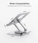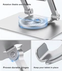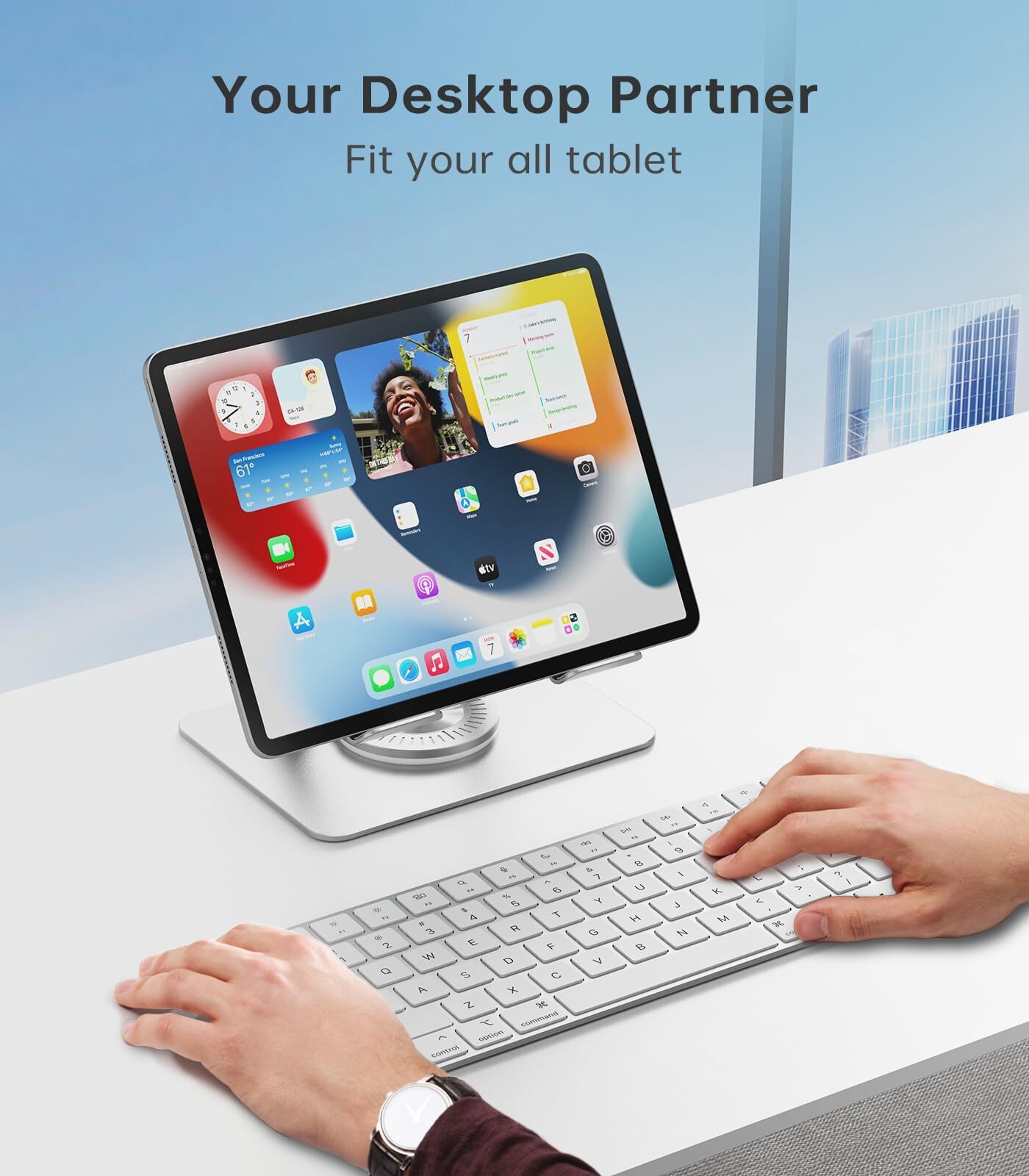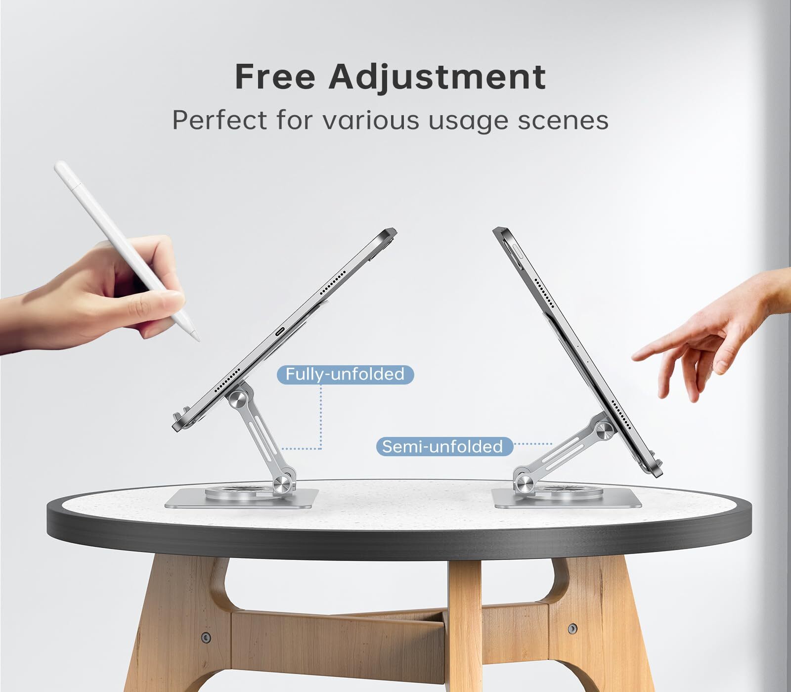 Adjustable & Comfortable. This tablet stand is easy to elevate and tilt your tablet to a perfect viewing angle, ensuring you are comfortable while watching movies, reading e-books, using Facetime, zoom meetings, doing homework, viewing recipes, and enjoying games. Rotatable & Convenient. With a 360° rotation base, you can freely adjust the angle of the tablet stand holder to set the best viewing angle that suits your preference, also making it extremely easy to share content. Universal Use. This adjustable tablet stand fits any tablet, e-reader, or smartphone up to 12.9’’ even with a case on, compatible with iPad Pro, iPad mini, iPad Air, iPad, iPhone 14 Pro, Samsung S22, Galaxy Tab S8, Lenovo, Fire tablet, and more. Sturdy & Stable. Premium aluminum alloy material ensures the stability and durability of this iPad tablet, and anti-slip rubber pads on the bottom and panel case keep your loved laptops firmly in place. Foldable & Portable. Measuring in size of 150*128*30mm/6x5x1inch, this compact tablet holder is easy to fold for storage and portability. Fit in your bag on the go to get work and entertainment done comfortably everywhere.
