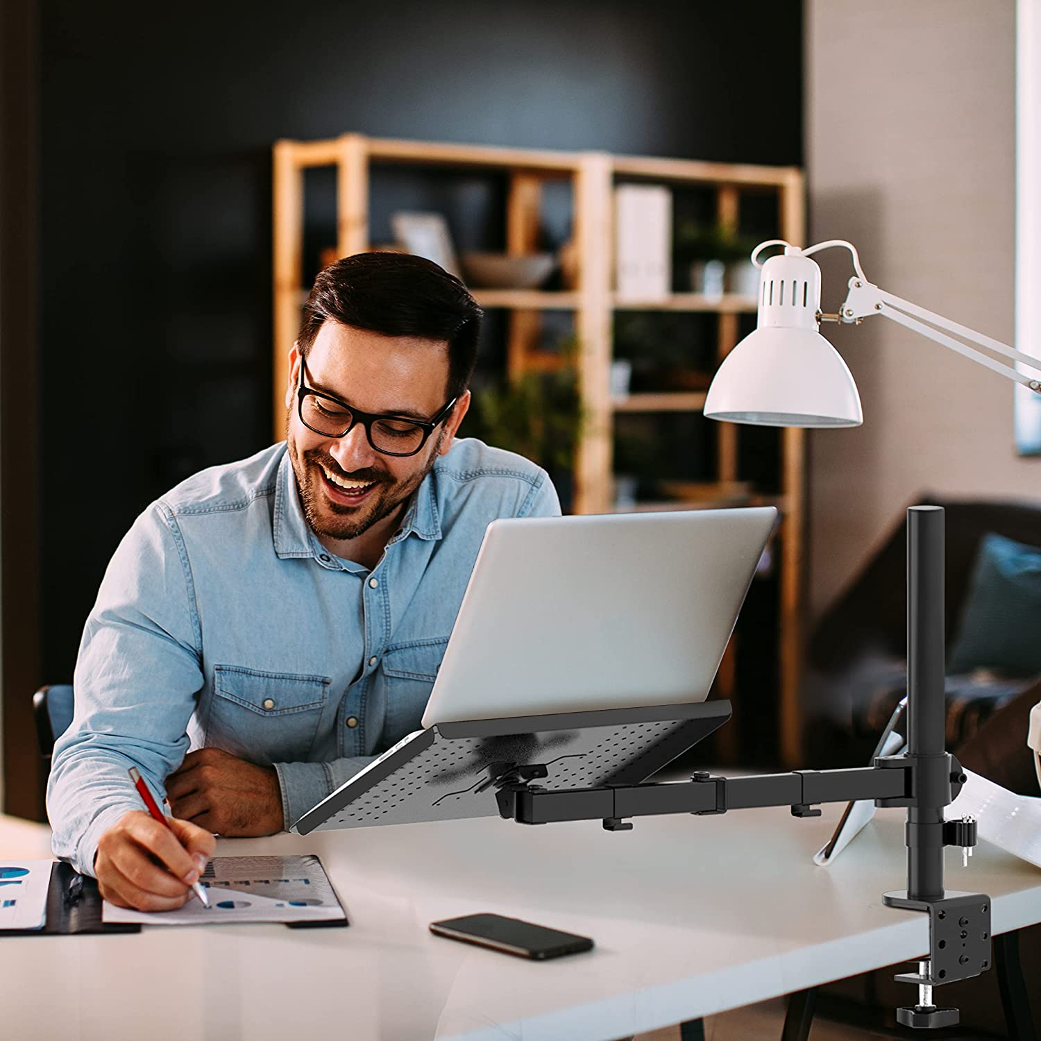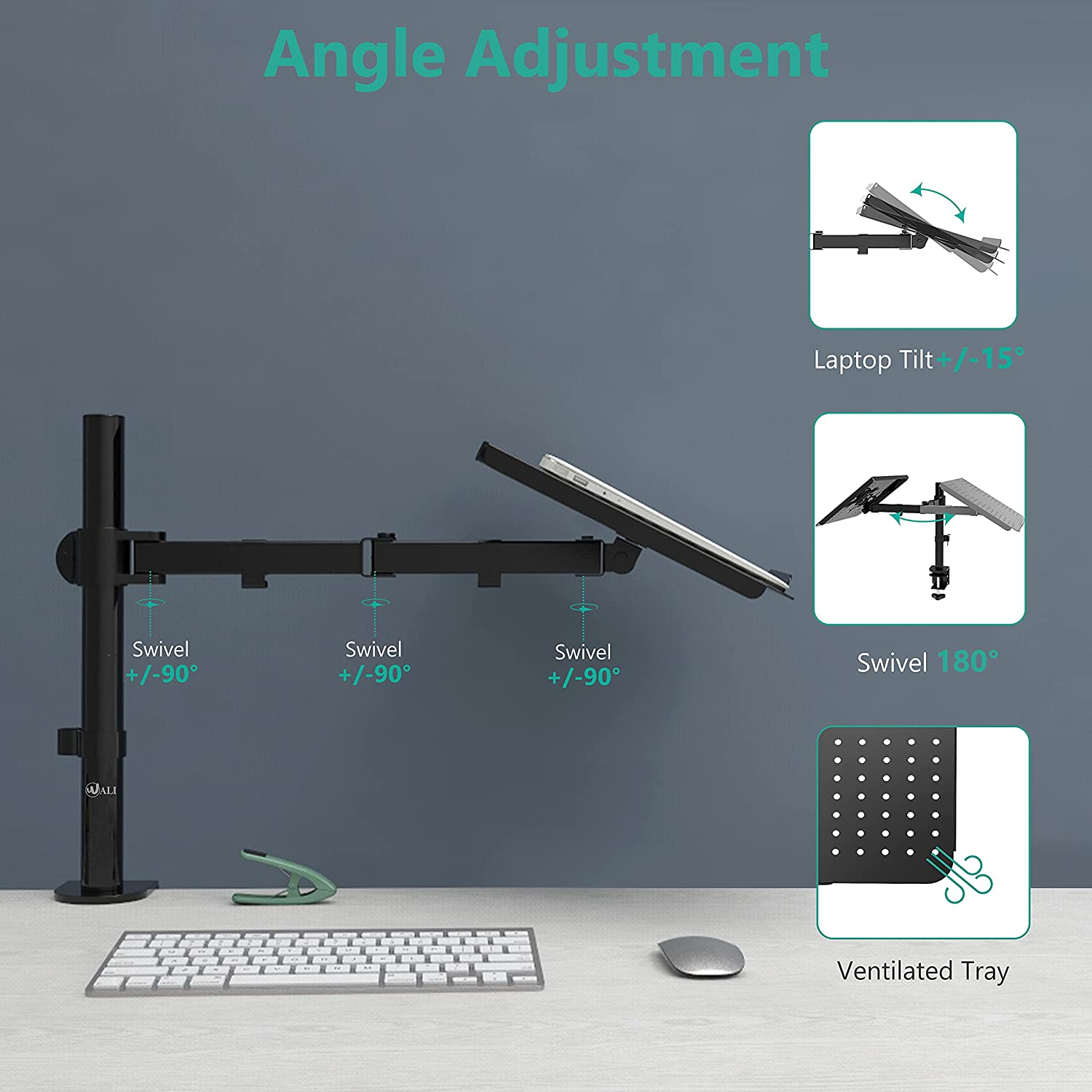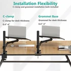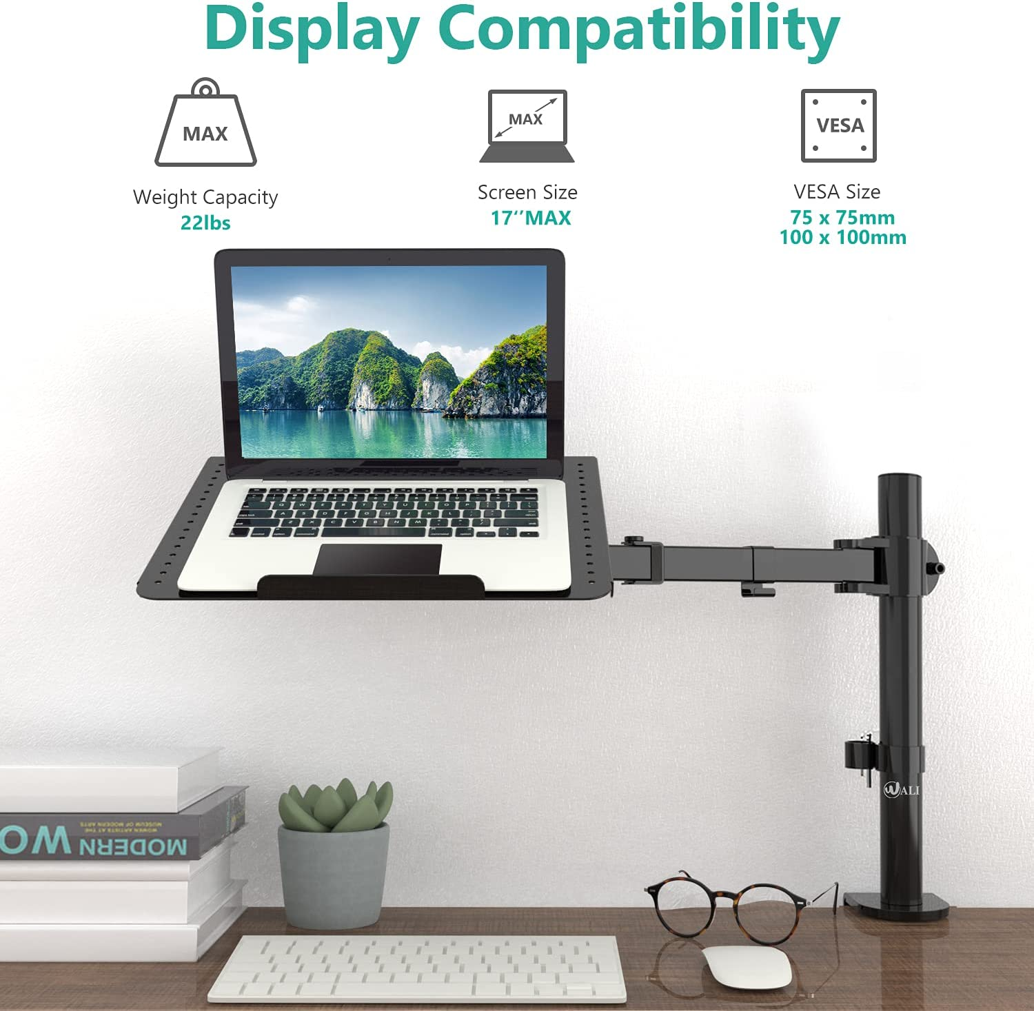Laptop Tray Desk Mount for 1 Laptop Notebook up to 17 Inch Fully Adjustable Compatibility: Fits one laptop or notebook up to 17” and supports weight up to 22lbs. Mount plates detachable and height adjustable. Dual mounting options for laptop or a monitor with VESA mounting holes 75x75mm and 100x100mm Multiple Options: The C-clamp is for 0.4”-4” thick desk and Grommet is for 0.4”-3” thick desk. Multiple Adjustment: The high-grade arms extend, retract and easily adjustable on a 16” height pole, +/-15° tilt, +/-90° swivel and 360° rotate to change reading angles Cool Design: Venting holes on laptop tray absorb cooling air from laptop fan. Tray measure 14 x 11 inch (L x W), with a 0.6” protruding bottom lip Package Includes: 1 x WALI Laptop Tray Desk Mount (Black), 1 x Mounting Hardware Kit, 1 x User Manual, experienced and friendly US based customer support available to assist 7 days a week. Product Description Why choose WALI? WALI is committed to building high-quality mounts for every budget and everyone. From monitor mounts to speaker mounts and projector mounts, our collections achieve the optimal balance between functionality, design, and aesthetics. M00LP The mount raises your laptop to an ergonomic viewing height, effectively reducing stress on the neck and back. High-quality metal materials with vented tray ensure the safety of your laptop. Screen size: up to 17inches Weight: 22lbs VESA: 75x75mm and 100x100mm Tilt: +/-15° Swivel: +/-90° Rotate: 360° Stable and Durable Tighten the nut on the VESA plate with a wrench to prevent the laptop from wobbling. Metal tray securely holds your laptop. Ventilated Design The vented holes on the detachable laptop tray provide better air flow and keep the device running cool. Tilt +15°/-15° Easily adjust the tilt angle of the laptop tray for a more comfortable and ergonomic view of the contents of the laptop. Capacity: 22lbs 22lbs 22lbs 22lbs 22lbs 17.6lbs Fits Screen Size: up to 17'' Up to 27'' Up to 27'' Up to 27'' Up to 27'' Up to 32'' Tilt: +15°/-15° +90/-90⁰ +90/-90⁰ +90/-90⁰ +90/-90⁰ +35°/-35° Rotate: 360° 360° 360° 360° 360° 360° Stand-up Options: - - ✓ - ✓ ✓ Gas Spring Arm: - - - - - ✓ Pole Height: 16'' 16'' 31.5'' 16'' 31.5'' - 4.06 inches x 17.24 inches x 11.14 inches. Weight: 11.18 lb Quality Good Easy To Use Yes Durable Yes Brand Unbranded Item model number M00LP Whats in the box Laptop Tray Desk Mount Color Black Is Discontinued By Manufacturer No Product Dimensions 17.24 x 4.06 x 11.14 inches Compatible Devices Laptops Other display features CE Item Weight 11.18 pounds Department Mount Special features Adjustable Compatible Phone Models iPhone Form Factor Notebook