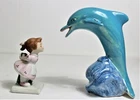 Sky Blue jumping Porcelain Painted Dolphin excited for gift from adorable girl. "In good condition" but small cut in Dolphin's mouth. Dolphin: Height: 6.5" Width: 5" Adorable Girl with gift pack: Height: 4" Width: 3"