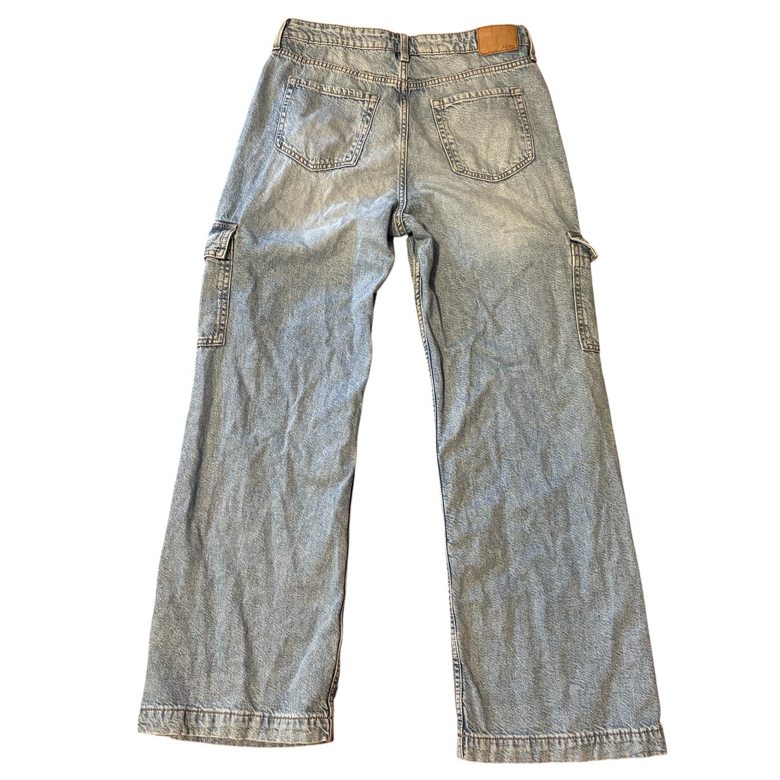 The Aeropostale Cargo Jeans for women in size 12 feature a high rise wide leg fit, making them a trendy and comfortable choice for everyday wear. These baggy utility jeans have a solid blue color with a light wash, crafted from a blend of lyocell, cotton, and cotton denim. The jeans are equipped with a zip and button closure, cargo and slash pockets, and a regular fit, perfect for a casual yet stylish look. Whether it's winter, summer, fall, or spring, these versatile jeans can be styled to suit any season, adding a touch of indie and grunge flair to your wardrobe.