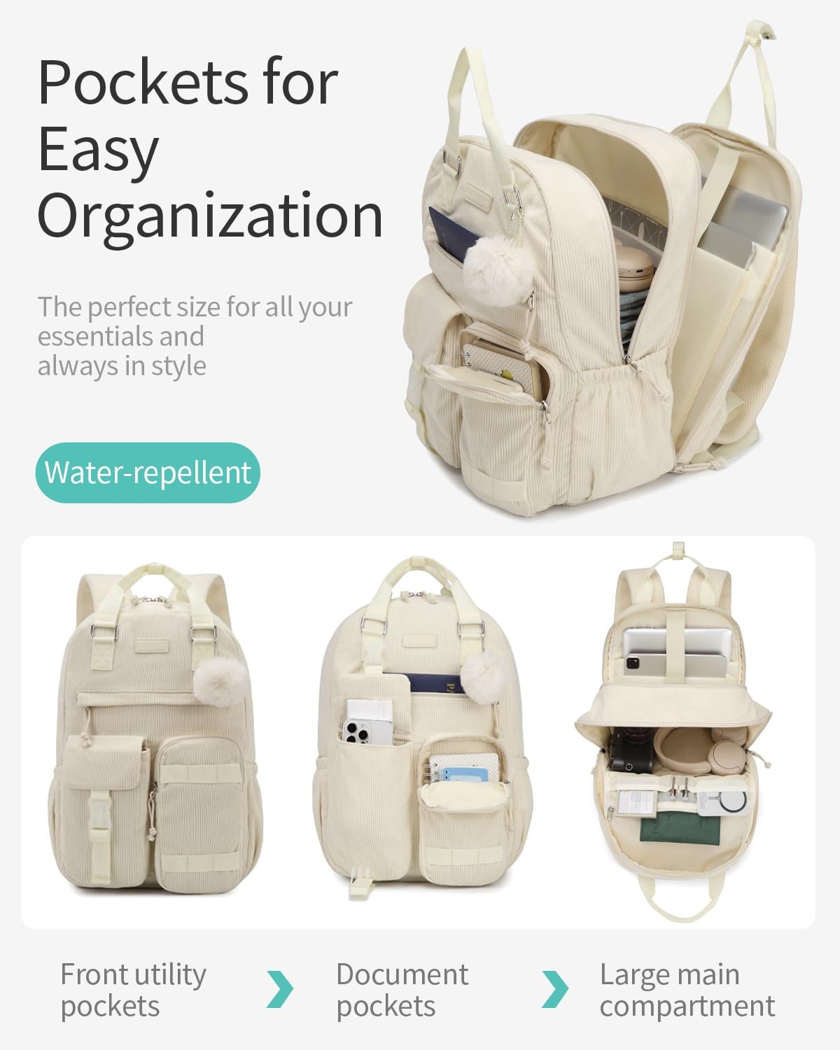 Kids school backpack: Simple & convenient design, independent 15.6"/17.3" laptop sleeve, 1 huge main compartment for A4 folders, books and lunch box, middle pocket with organizer, 2 front utility pockets, 2 side pockets and a back anti-theft pocket. Whether your carrying textbooks, tech gadgets, or travel essentials everything has its place within this versatile pack. A Lots of Useful Pockets: Simple & convenient design, independent 15.6"/17.3" laptop sleeve, 1 huge main compartment for A4 folders, books and lunch box, middle pocket with organizer, 2 front utility pockets, 2 side pockets and a back anti-theft pocket. Whether your carrying textbooks, tech gadgets, or travel essentials everything has its place within this versatile pack. Lightweight but Durable: backpack are made with durable corduroy, lining, zippers & straps in colors & designs. The perfect blend of style, durability, and light design for school, playdates, or family outings. Comfortable Even After All-Day Use: Equipped with adjustable, S-curve padded shoulder straps, our backpacks minimize strain on your back, making them easy and comfortable to carry throughout the day. With a luggage strap that can free up the shoulders when you are traveling. Travel Friendly: With TSA laptop compartment get you through airport security checkpoints quickly and easy to access your laptop during travel. Top handle provides you with multiple carrying options. Both side pockets have elastic closures for larger water bottles. Gifts for School Year: Featuring a practical silhouette and cute accessories that always looks amazing. It is a Eye-catching backpack. Ideal for elementary, middle, high, and college students.
