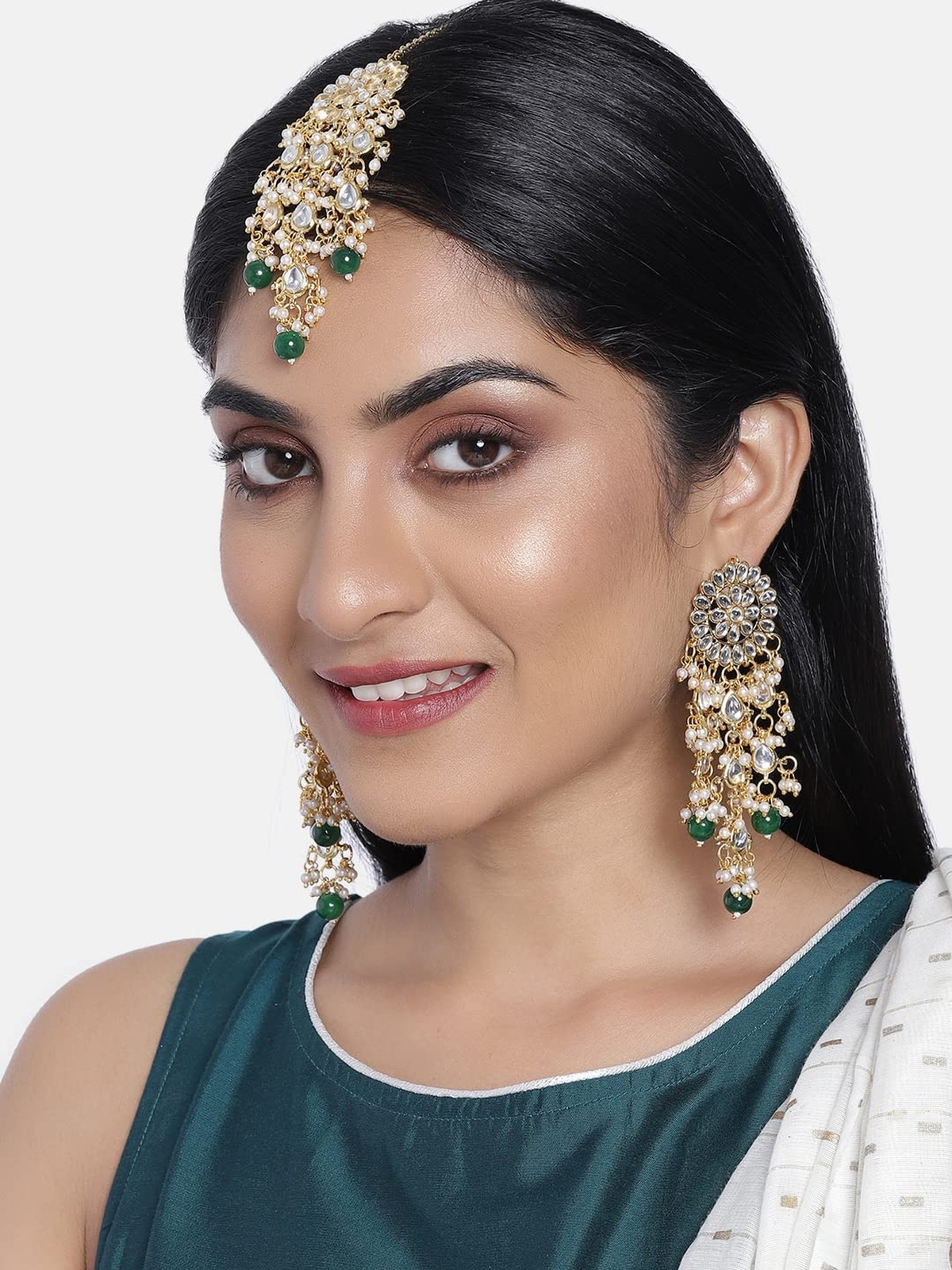 Aheli Kundan Studded Beaded Chandelier Classic Drop Earrings Maang Tikka Indian Traditional Bollywood Jewelry Set Gift for Women Product Details Color: Green Brand: Aheli MPN: AH-PF26ET114 UPC: Does not apply EAN: Does not apply Item model number : AH-PF26ET114 Department : womens Date First Available : May 16, 2024 Brand, Seller, or Collection Name: Aheli Metal stamp: no metal stamp Setting: other setting type Item Length: 4.72 inches Chain: Bead Clasp: Lobster Clasp Ring size: adjustable Number of stones: 5 Model number: AH-PF26ET114G