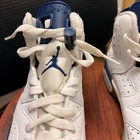 7 Y or womens 8 1/2 Stylish white and blue Air Jordan sneakers. Perfect for casual wear. Location Lh JLy9